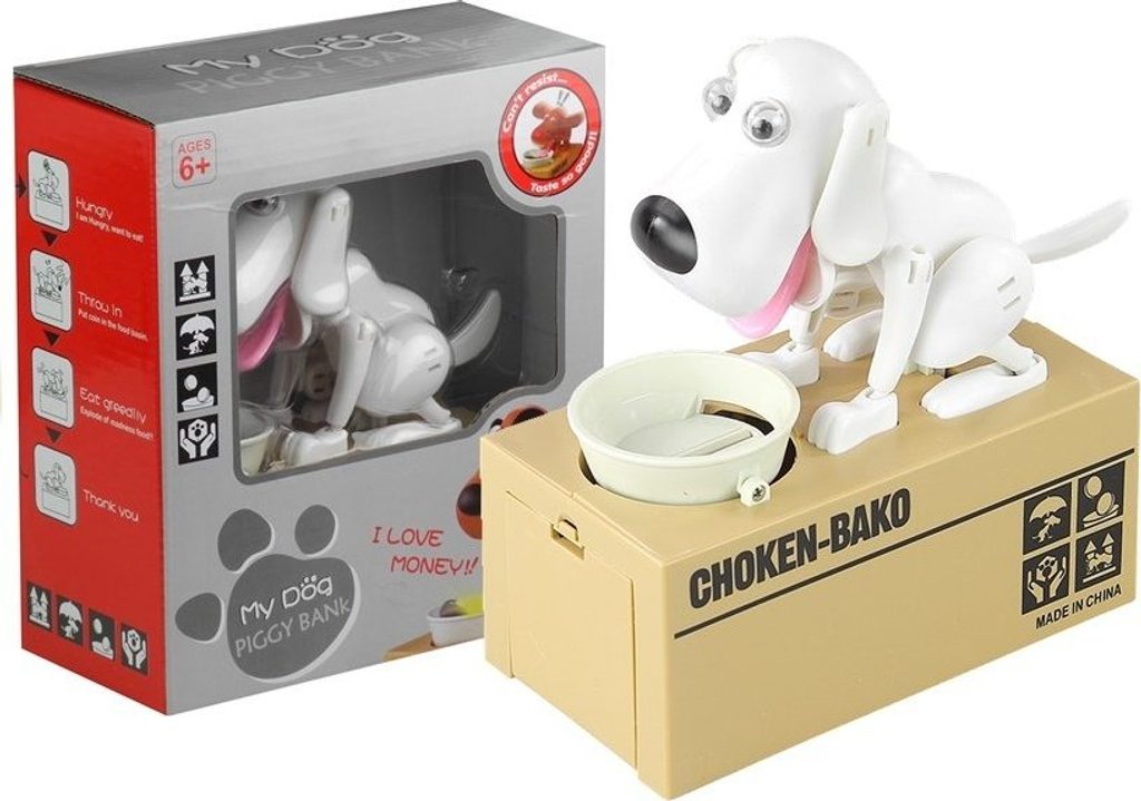 Veselý pes je velmi hladový a sní o jídle. Nedokáže se ubránit snězení všeho, co mu spadne do misky. Hoďte tam minci a sledujte, jak se zbláznil do jídla a chtivě hledá pamlsek. Tato originální interaktivní kasička je nesmírně zajímavá. Pohyblivý pes pomůže vašemu dítěti pochopit, že šetřit peníze je velmi důležité a má jen výhody – a používání prezentované kasičky je velmi efektní a zábavné .