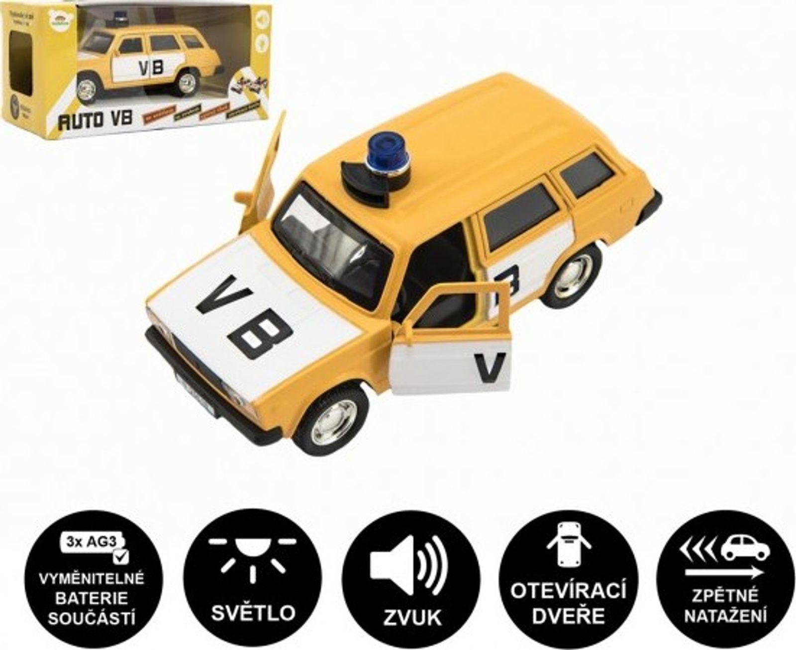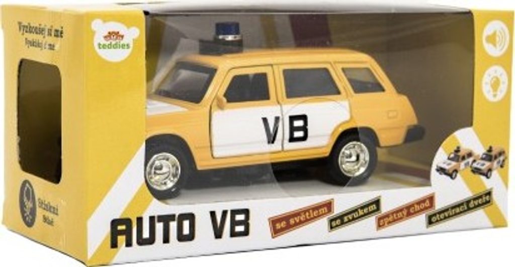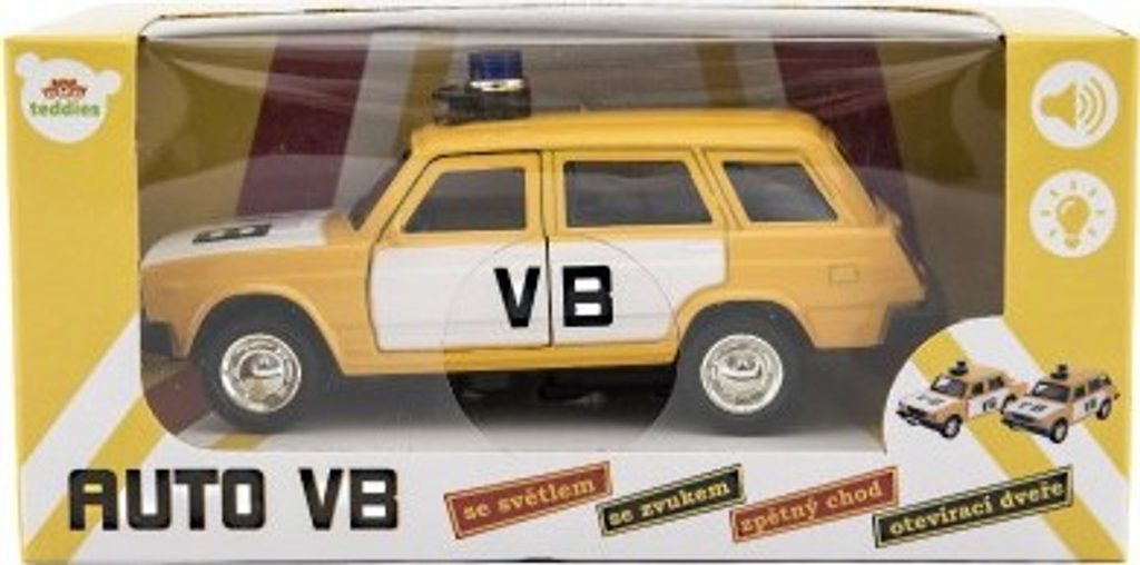 Krásný model policejního auta VB Lada combi, který nesmí chybět v garáži žádného malého policisty. Model má otevírací přední dveře. Auto velikosti cca 12 cm je se světlem zvukem a na zpětné natažení. Baterie 3x AG3 jsou součástí výrobku.