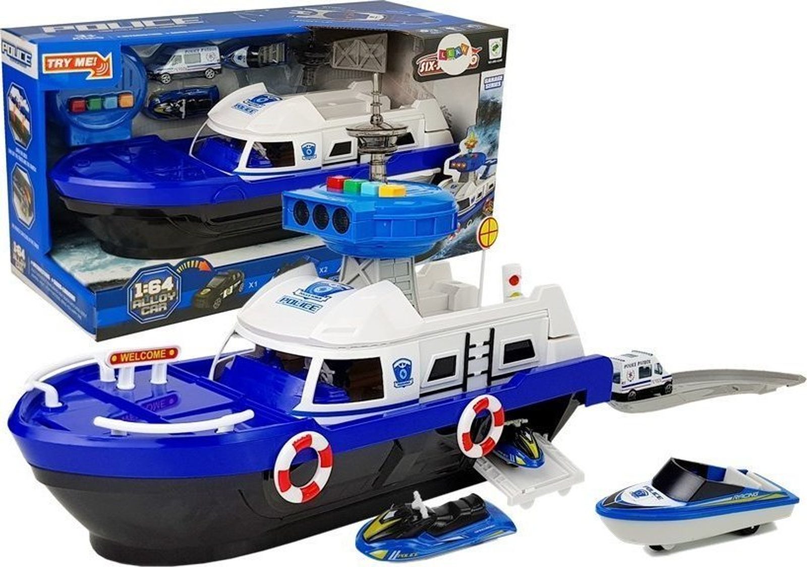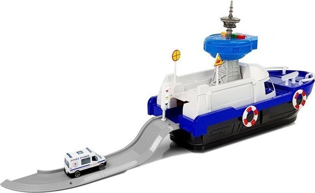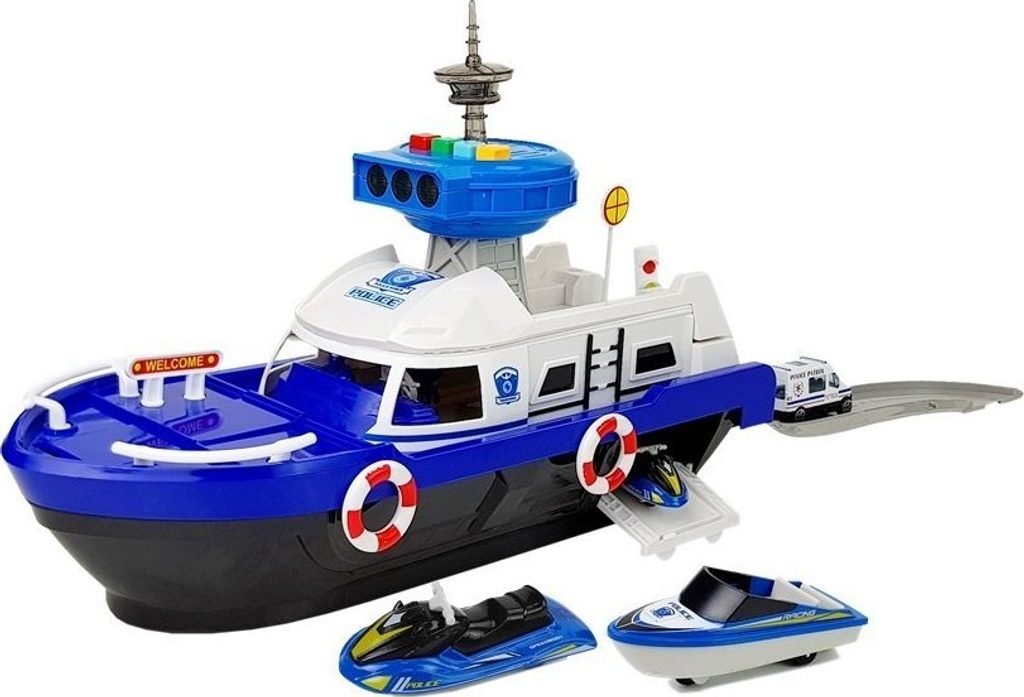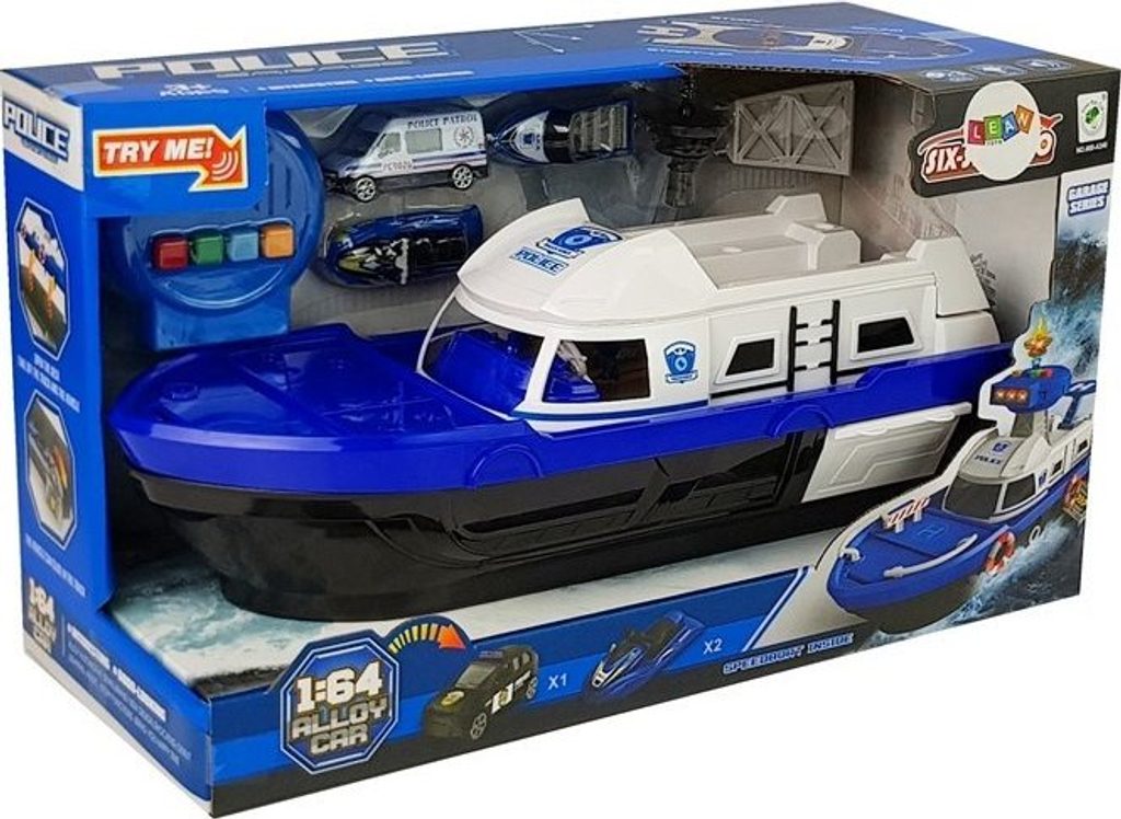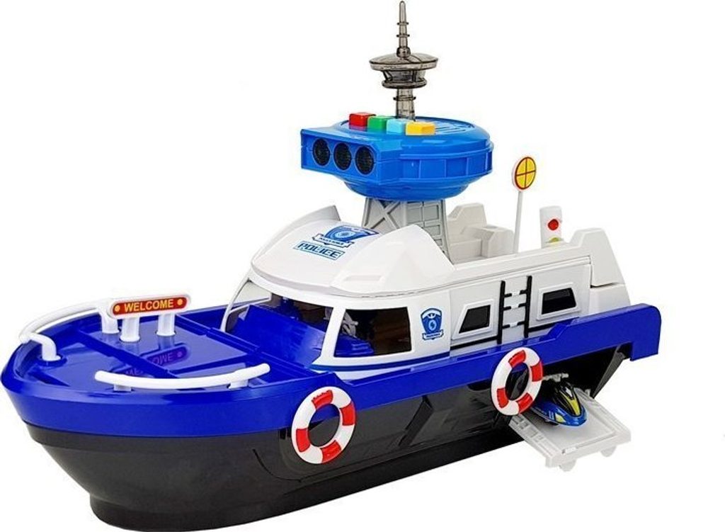 Loď je bílá a modrá s policejními nálepkami. Po stranách jsou záchranné kruhy, které dodávají realističnost. Hračka se pohybuje na kolečkách upevněných ve spodní části. Řídicí věž vydává policejní zvukové a světelné signály.