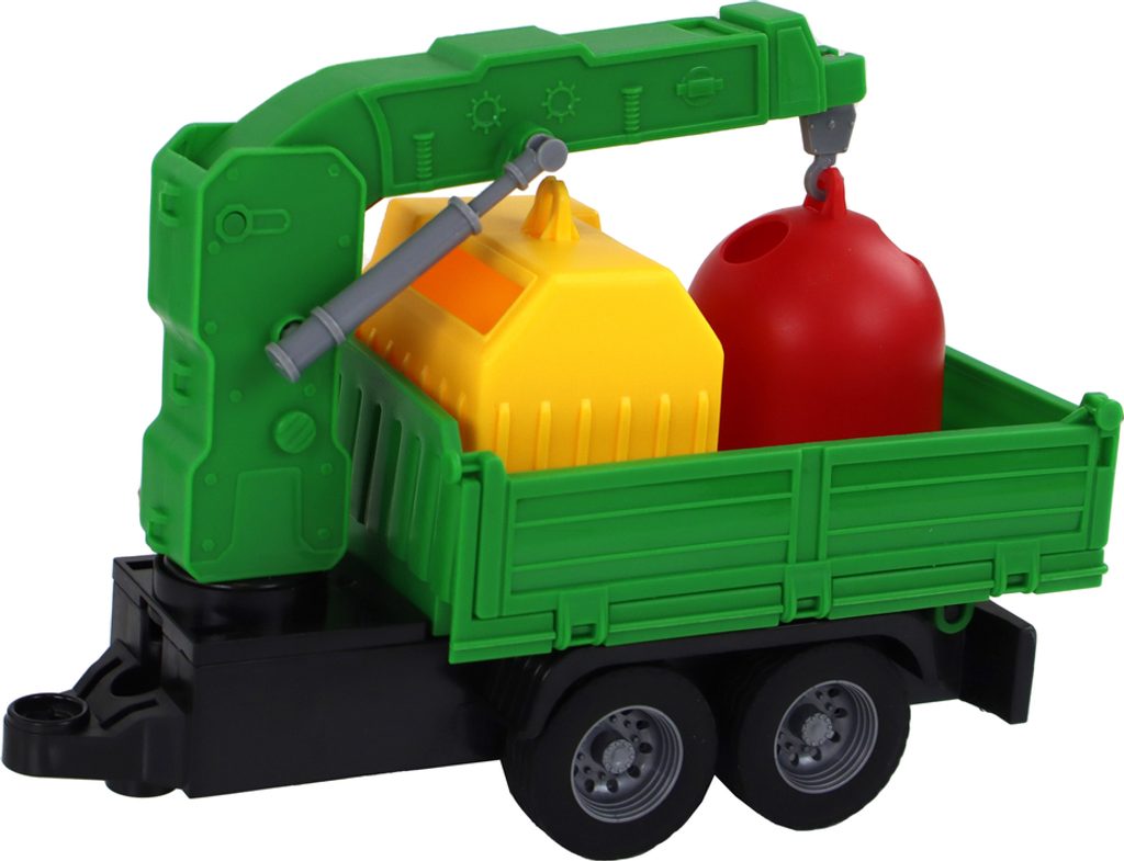 Další atrakcí je přívěs s jeřábem. Rameno jeřábu se zvedá a přidává do hry prvek interakce a kreativity. Dítě může zvedat a spouštět kontejnery, hrát scénky se sběrem a tříděním odpadků.