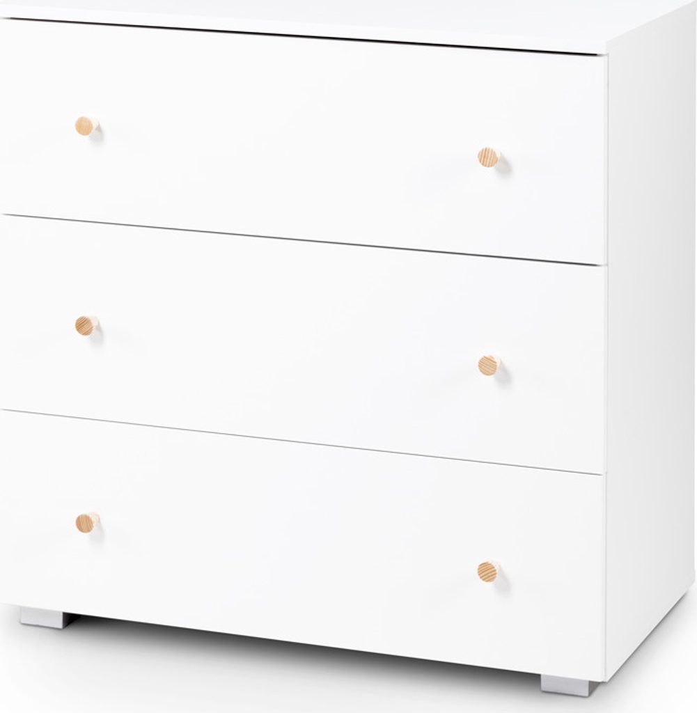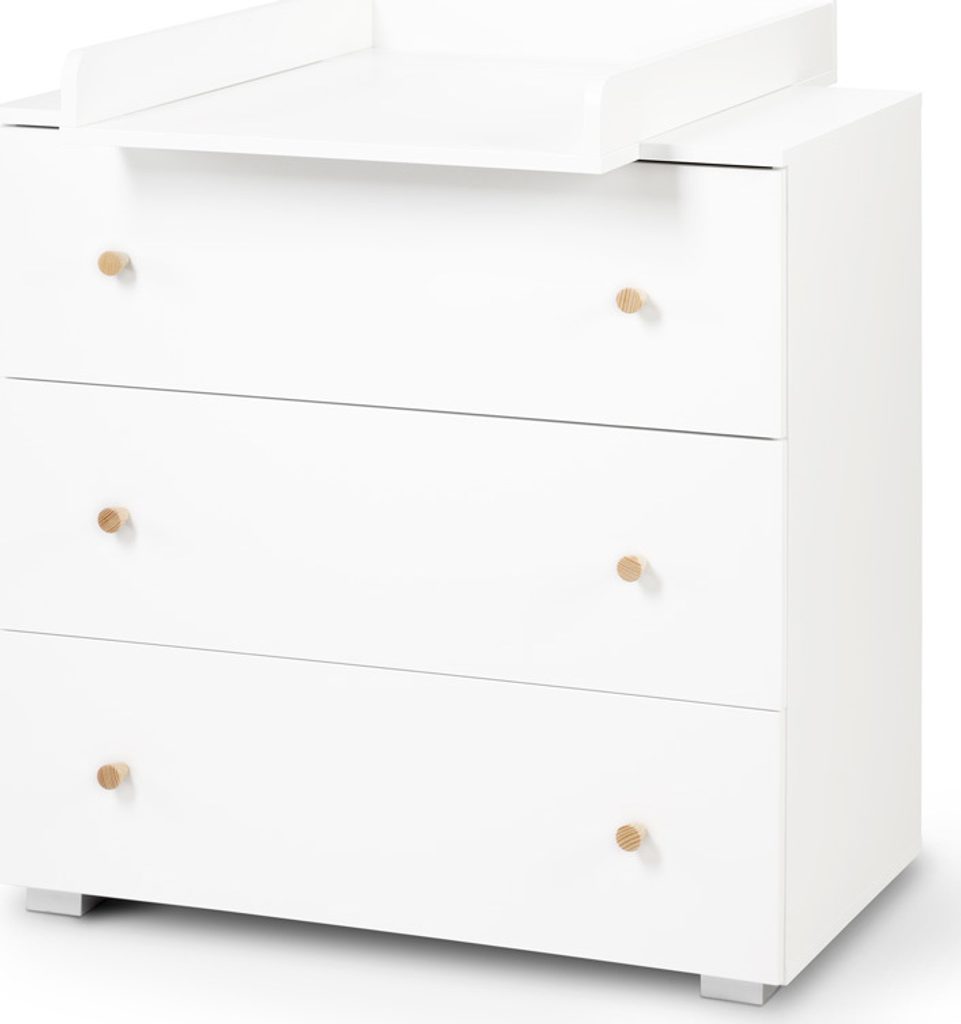Přebalovací komoda Klups KAROLINA v bílé barvě s přírodními úchytkami z borovice je důležitou součástí dětského pokoje. Tato komoda je vybavena třemi šuplíky a odnímatelným přebalovacím pultem, což z ní činí praktickým kusem nábytku pro rodiče i děti.