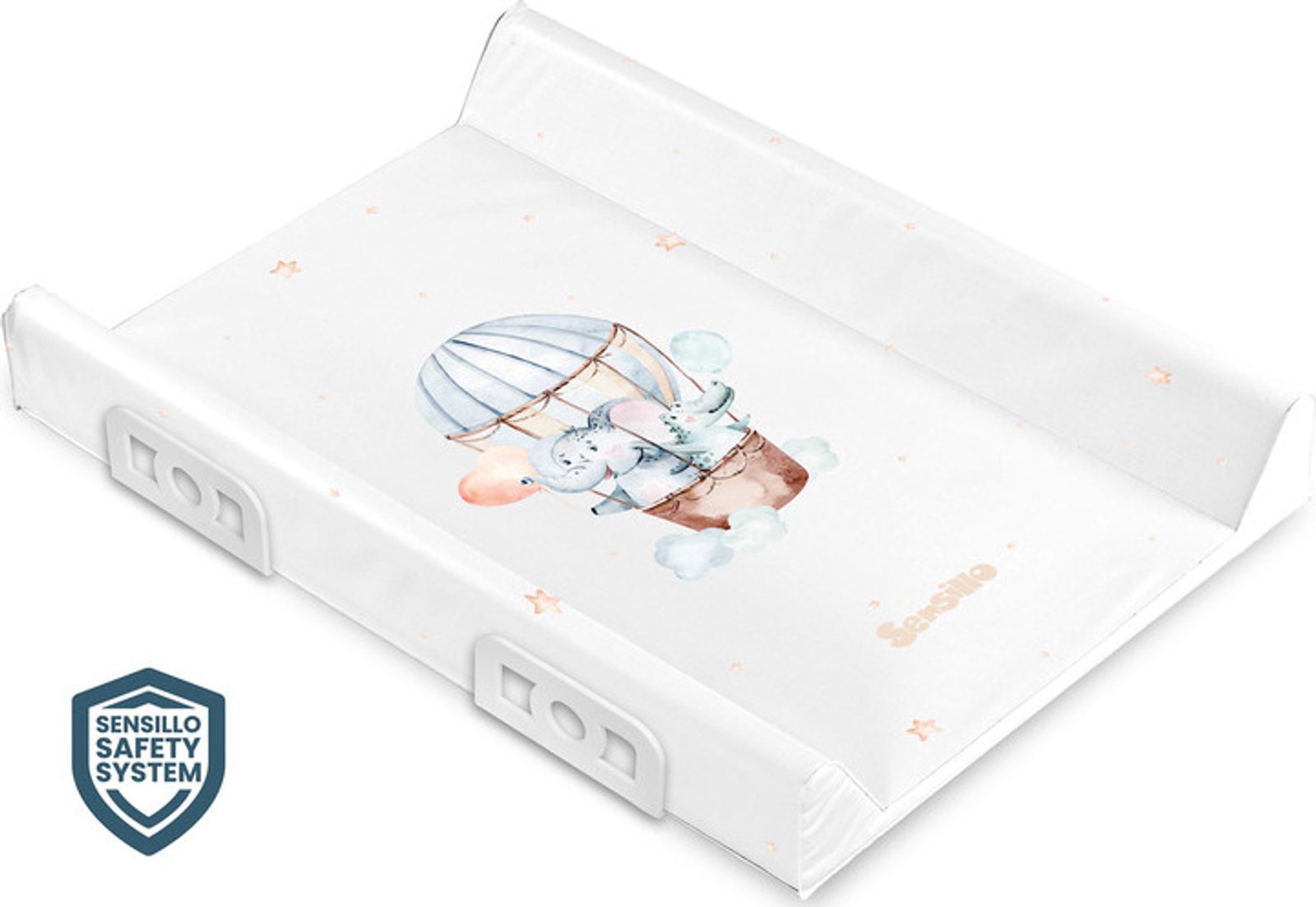 Vyztužená přebalovací podložka Sensillo byla připravena pro pohodlnou péči o nejmenší. Nohy, které jsou součástí sady, umožňují bezpečnou a stabilní instalaci přímo na postýlku o šířce 60 cm. Přebalovací pult lze namontovat i na komodu nebo jiný stabilní povrch. Přebalovací pult se vyznačuje inovativním bezpečnostním systémem Sensillo Safety System, který zabraňuje vypadnutí dítěte díky dodatečným bočním výztuhám. K výrobě jsme použili nejkvalitnější materiály zajišťující maximální bezpečnost a komfort používání. Povrch na přebalovací podložce Sensillo je zcela bezpečný pro zdraví miminka - neobsahuje ftaláty, těžké kovy a jiné škodlivé látky.