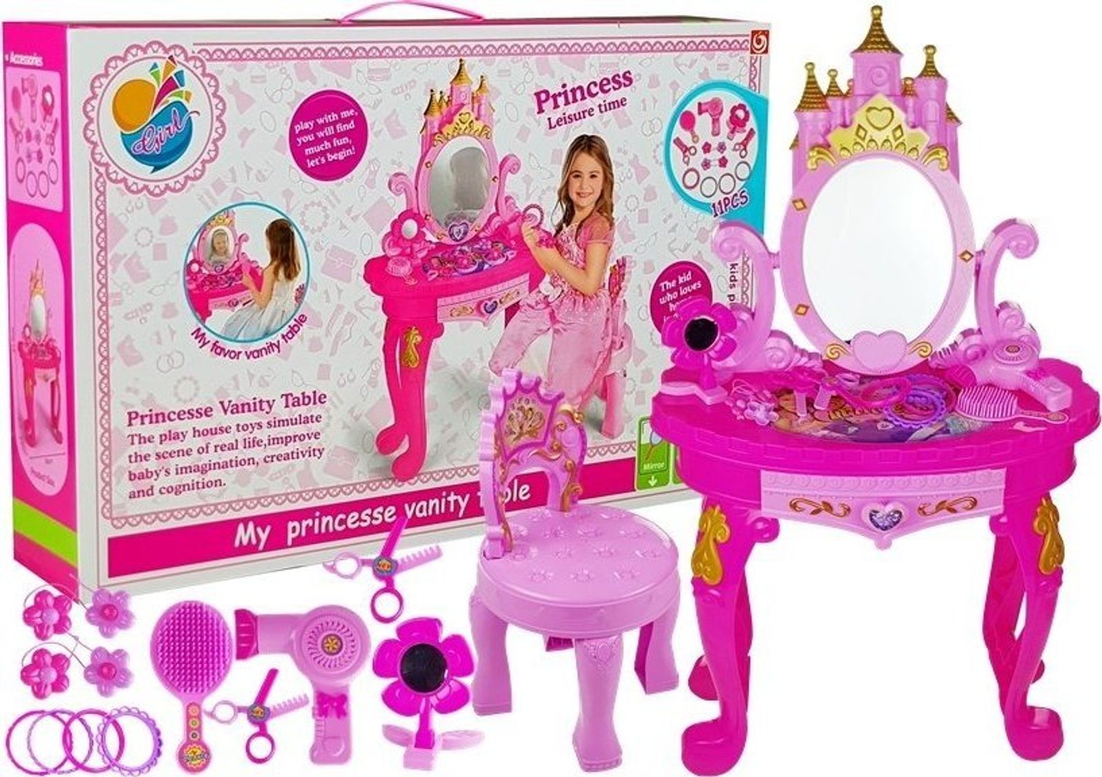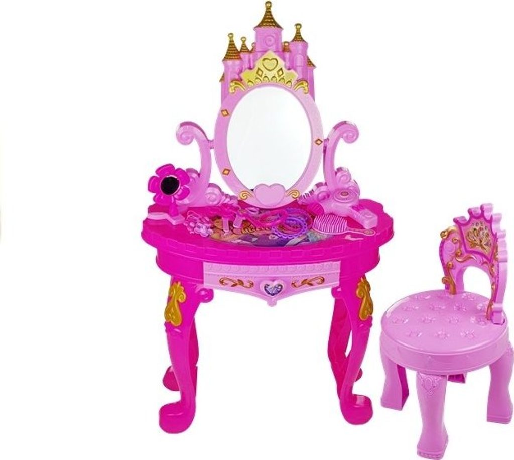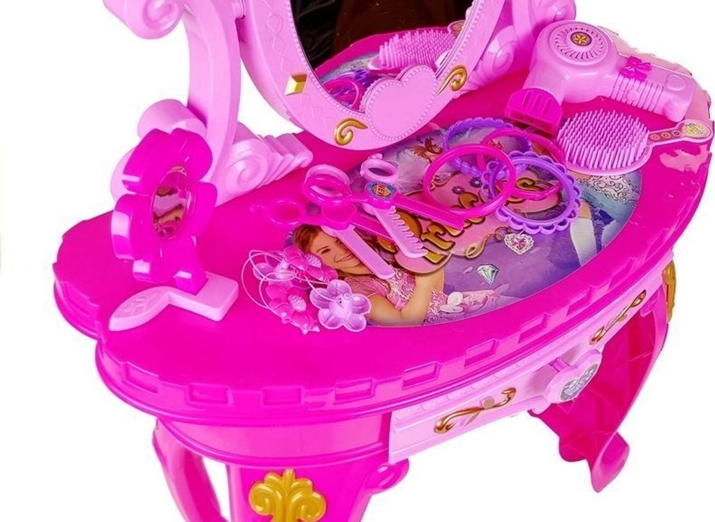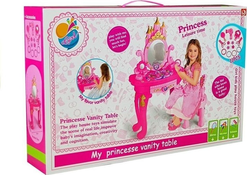 Toaletní stolek je skvělý nápad na dárek pro malou parádnici . Okouzlující set ve velmi holčičí edici umožní každé princezně hrát si před zrcadlem už od rána. Hračka byla navržena pro nejmenší dívky, a proto byla vyrobena z certifikovaných, zcela bezpečných materiálů . Design toaletního stolku se také skládá z oku lahodících, proudnicových tvarů bez ostrých konců. Dětský psací stůl se zrcadlem má certifikát CE a je určen pro malé slečny od 3 let.