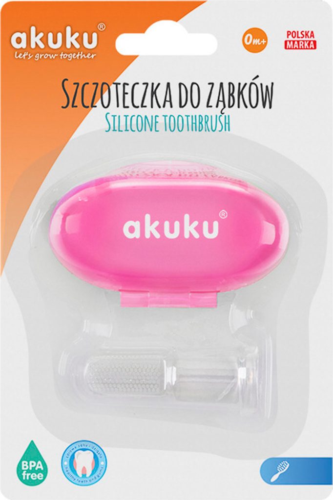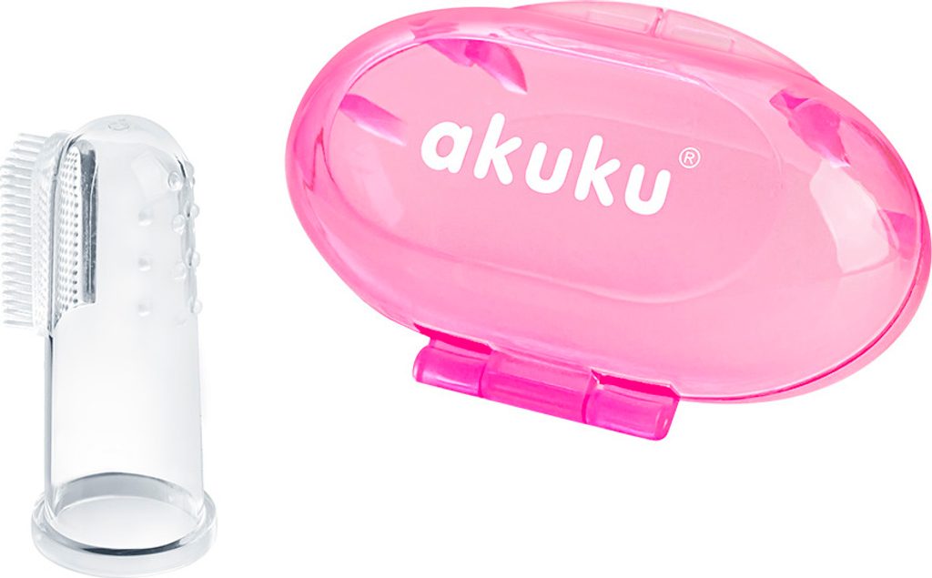 První zubní kartáček Akuku je určen pro děti od narození. Kartáček má praktické pouzdro. Je vyroben ze silikonu. Neobsahuje BPA.