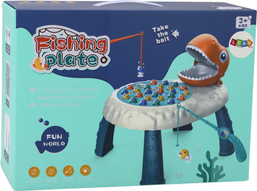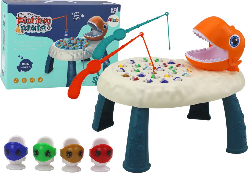 Ústředním prvkem této hry je otevírací tlama oranžového dinosaura. Právě sem umístíme ulovené ryby, díky čemuž je hra dynamičtější a napínavější. Sada obsahuje až 26 barevných rybiček, které si děti mohou vyzkoušet ulovit pomocí dvou rybářských prutů vybavených magnety.