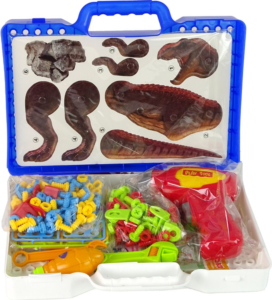 Sada obsahuje 2 talíře s díly dinosauřího těla a 8 talířů s figurkami, které lze sestavit do různých konfigurací. Sada navíc obsahuje barevné plastové šrouby, krytky, vrtačku, šroubovák a 2 klíče.