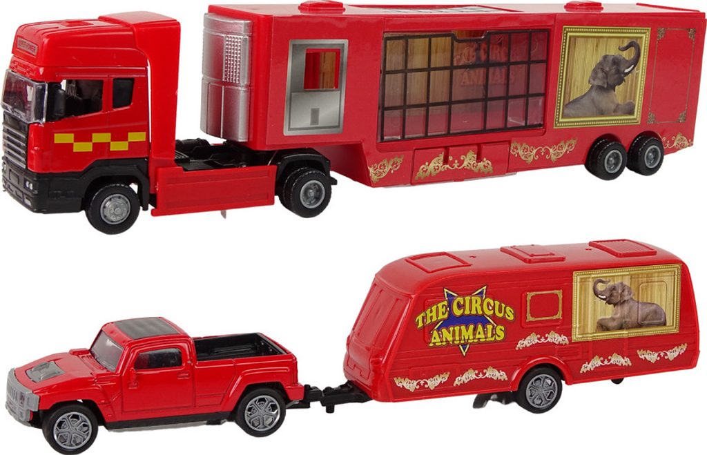 Sada Circus Vehicles je skvělý tip na dárek. Dítě zde najde jak velký nákladní vůz pro přepravu zvířat, tak pick-up s kempinkovým přívěsem. Součástí sady jsou také dvě divoké kočky - lev a tygr. Hraní s naší sadou podpoří kreativitu vašeho dítěte a poskytne skvělou zábavu na mnoho hodin. Traktor a pickup jsou vyrobeny z kovu, což zaručuje odolnost a kvalitu soupravy.