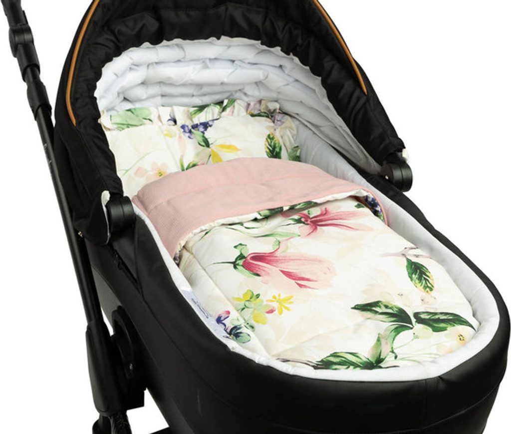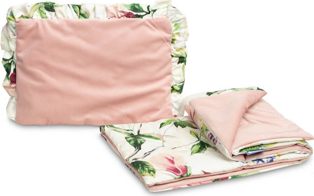 Sametová souprava do kočárku s volánkem je atraktivním artiklem v sortimentu Sensillo. Sada obsahuje krásný volánkový polštář a peřinu s jemnou výplní. Oboustranná souprava je vyrobena z kvalitních materiálů - barevná bavlna a velmi příjemná sametová látka, která pomazlí každé miminko. Set se skvěle hodí do kočárku, postýlky, kolébky nebo jako podložka pro miminko. Polštář samotný lze použít jako plyšovou hračku.