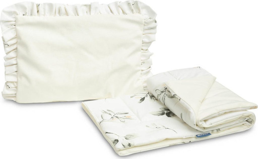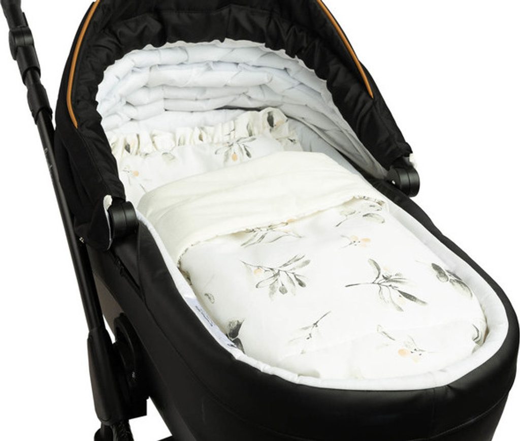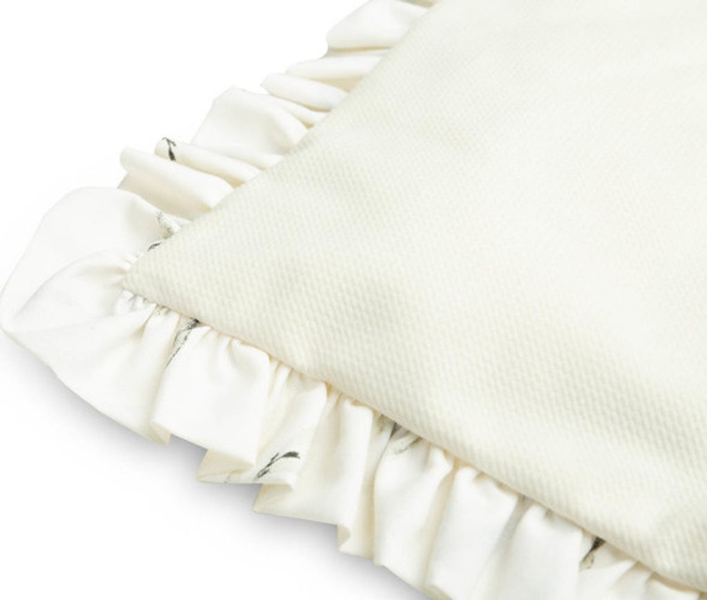 Sametová souprava do kočárku s volánkem je atraktivním artiklem v sortimentu Sensillo. Sada obsahuje krásný volánkový polštář a peřinu s jemnou výplní. Oboustranná souprava je vyrobena z kvalitních materiálů - barevná bavlna a velmi příjemná sametová látka, která pomazlí každé miminko. Set se skvěle hodí do kočárku, postýlky, kolébky nebo jako podložka pro miminko. Polštář samotný lze použít jako plyšovou hračku.