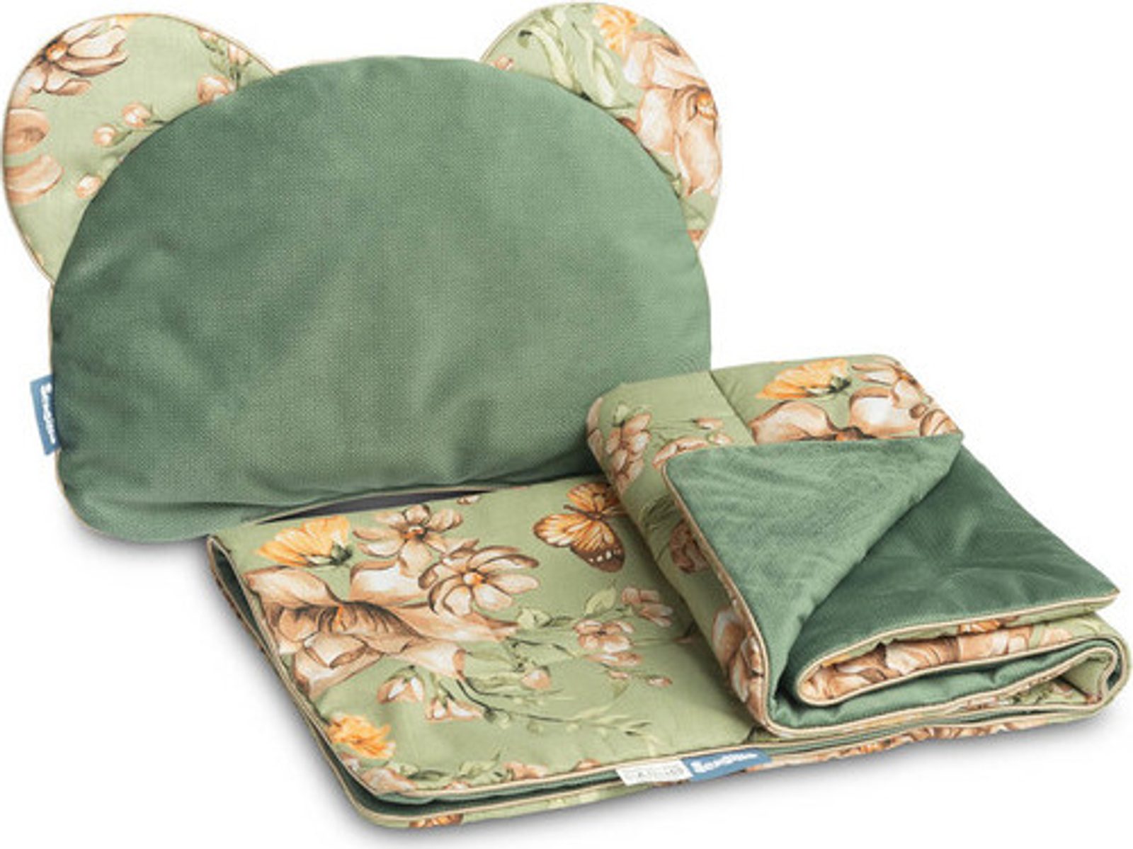 Sada obsahuje krásný polštářek s ušima medvídka a peřinku s jemnou výplní ze silikonového rouna. Oboustranná souprava je vyrobena z kvalitních materiálů - barevné bavlny a velmi příjemné sametové látky, která ukolébá každé batole. Sada je ideální pro použití v kočárku, postýlce, kolébce nebo jako podložka pro miminko. Samotný polštářek lze použít jako mazlík. Kvalitní zpracování podtrhuje estetické lemování.