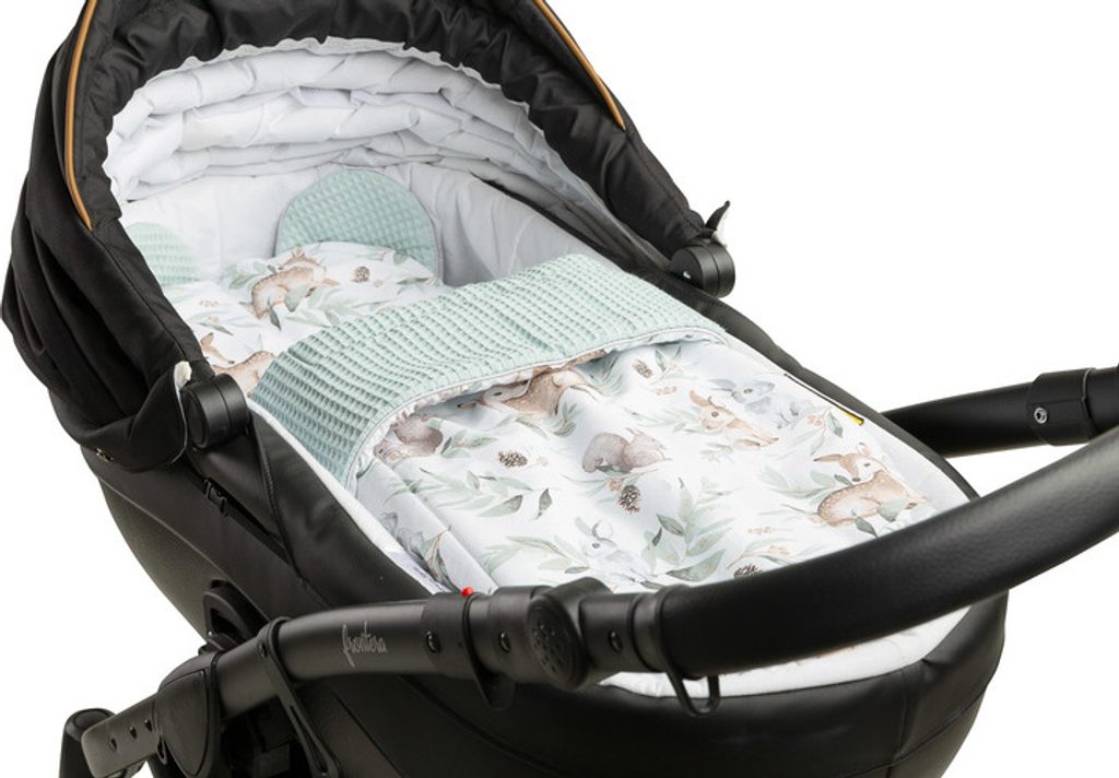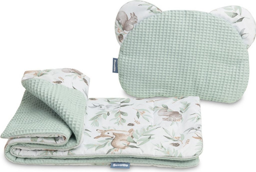 Komplet do kočárku se skládá z polštáře (36x28 cm) a přikrývky (56x76 cm). Díky takovým velikostem se set skvěle hodí do kočárku, postýlky nebo jako měkká podložka pro miminko. Uvnitř je antialergická výplň, která poskytuje dostatečnou izolaci proti chladu. Polštář samotný lze použít jako plyšovou hračku. Souprava je vyrobena z 100% bavlny - na jedné straně je potisk a na druhé straně jemná bavlna s vaflovou strukturou, která dodává celému setu jedinečný vzhled.