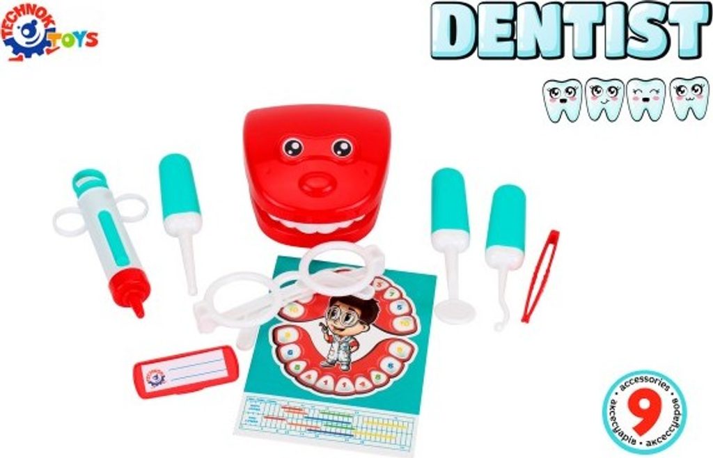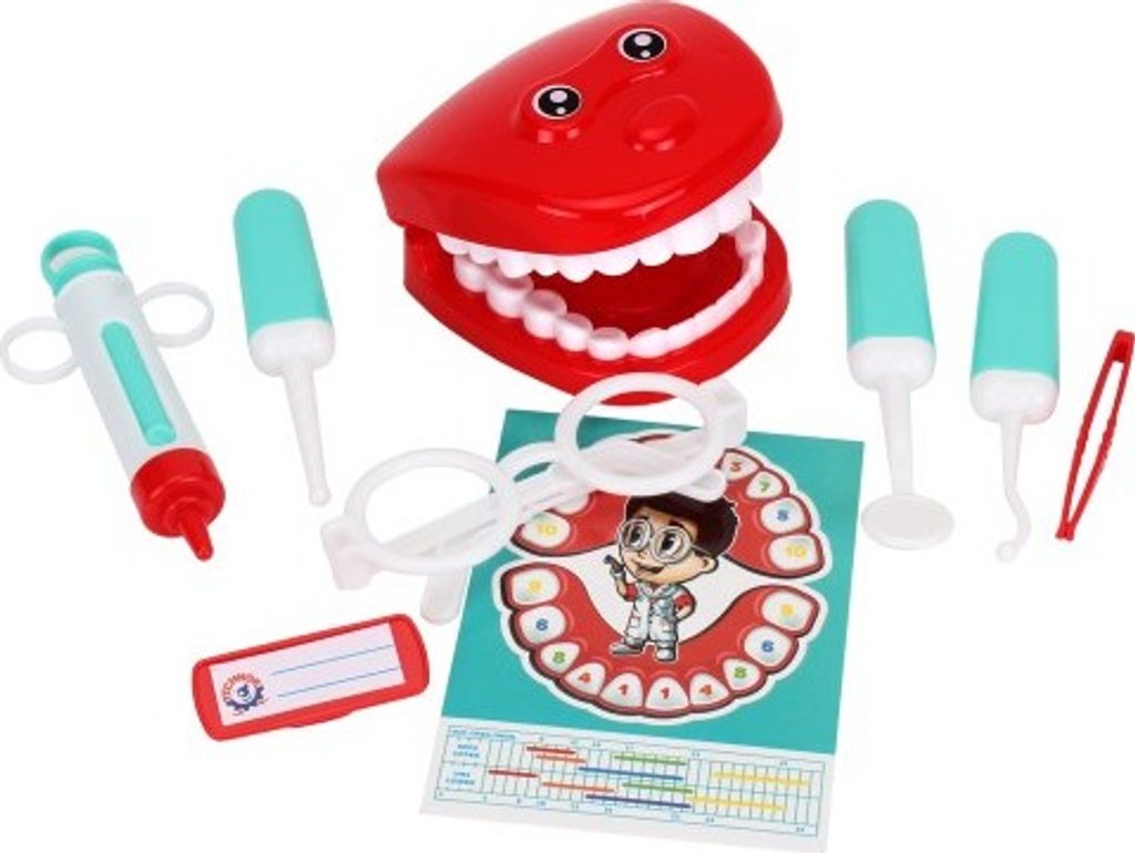 Doktorská sada představí dětem povolání zubaře. Sada obsahuje všechny potřebné nástroje pro vyšetření a ošetření zubů jejich oblíbených hraček: vrtačku, orální zrcátko, zubní sondu, stříkačku a pinzetu. S brýlemi a odznakem se dítě bude cítit jako skutečný zubař. Model čelisti pomůže podrobněji se podívat na zuby a podle schématu „číslování zubů“ se spolu s maminkou dítě může naučit, v jakém pořadí zuby rostou.