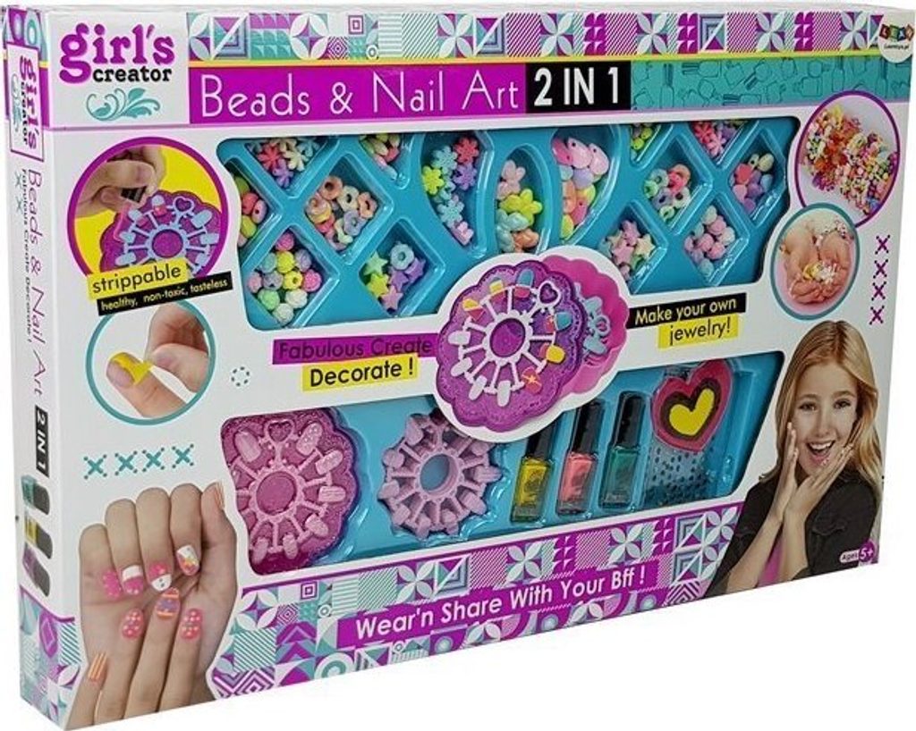 Pomocí laků a kamínků vytvoříte na nehtech krásný vzor, lak velmi rychle schne, takže si můžete rychle užít krásnou manikúru. Druhou částí jsou korálky. Množství různých tvarů (motýli, květiny, mušle) a barev jen povzbudí dívku, aby si začala hrát.