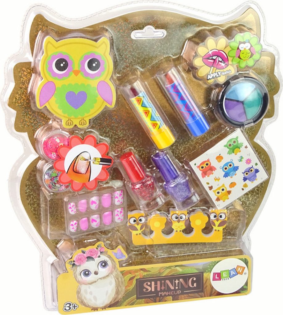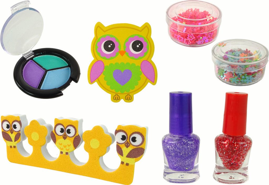 Sada kreativního make-upu a nail artu se rtěnkami, pilníkem ve tvaru sovy, samolepkami, třpytivými laky na nehty, stíny a flitry. Vytvořte kouzelné styly! Balení: 28 cm x 32 cm x 4 cm.