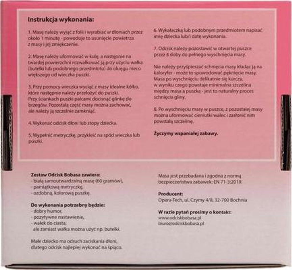 Sada se skládá z ozdobné krabičky, ve které je umístěna sádrová hmota. Je připravena tak, že si ji snadno a rychle připravíte k použití zcela sami. Hmotu stačí smíchat s doporučeným množstvím vody, vložit do ozdobné formy a poté chvíli počkat, než začne tuhnout. V tuto chvíli můžete udělat otisk ručičky nebo nožičky dítěte a na spodní straně víka vyplnit certifikát, který obsahuje místo pro zadání jména, věku dítěte a data otisku. Každá ze stavebnic obsahuje podrobný návod k použití, takže zhotovení hmoty na otisk nebude problém. Zhotovení pamětního otisku dětské ručičky či nožičky bude jistě velkou zábavou pro celou rodinu. Náš "Baby Print" je nápad na skvělou zábavu.