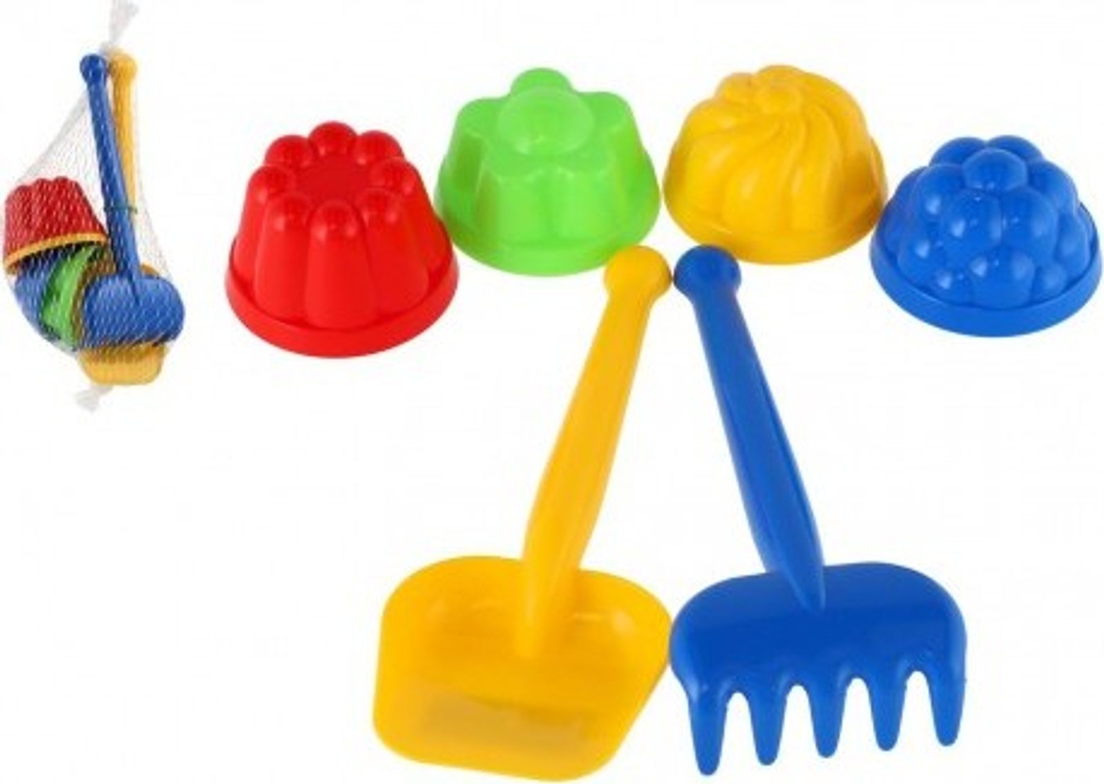 Klasické dětské plastové formičky na písek včetně hrabiček a lopatky z plastu pro děti na pískoviště v síťce. Hurá na pískoviště!!! Aby na něm byla dobrá zábava, nesmí tam chybět letní hračky na písek! Tvořítka na písek by neměly chybět žádnému dítěti. Užijí si s nimi spoustu zábavy při stavbě báboviček.