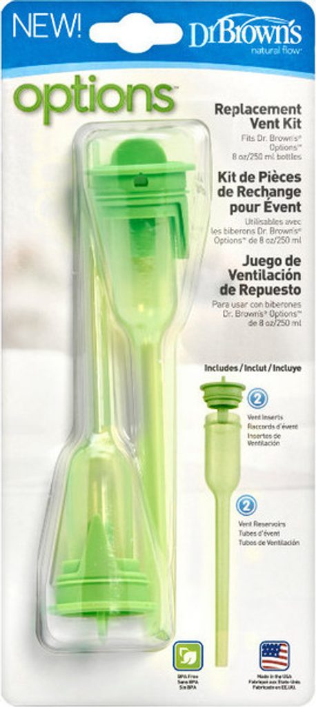 Sada náhradních dílů pro standardní (úzké hrdlo) lahvičky Options+ Dr. Browna o objemu 250 ml. Lahve Dr Brown's Options+ s ventilačním systémem regulují tlak uvnitř lahve. To snižuje koliku, říhání a plynatost. Sada je ideální pro výměnu opotřebovaných nebo poškozených částí antikolikového systému. Sada obsahuje: 2 uzávěry ventilačního systému, 2 nálevky pro ventilační systém. Výrobek se snadno udržuje v čistotě a neobsahuje bisfenol A. Lze jej mýt v myčce na horní polici a sterilizovat ve sterilizátoru.