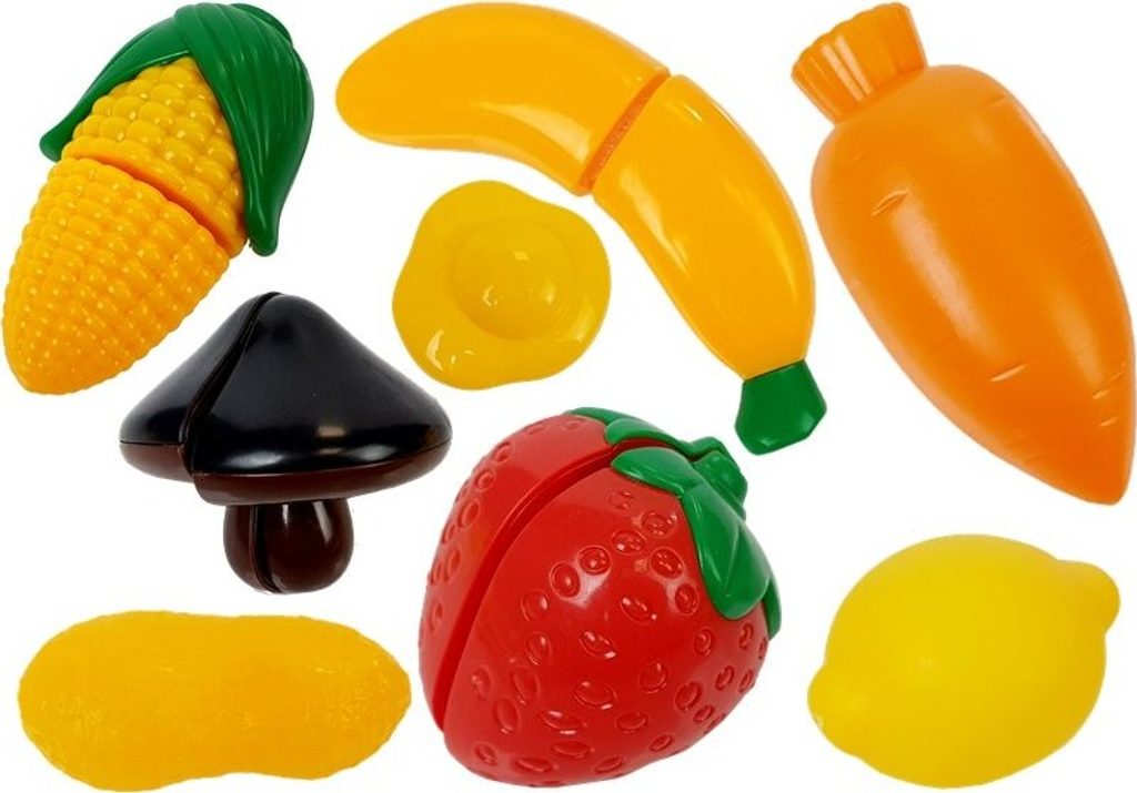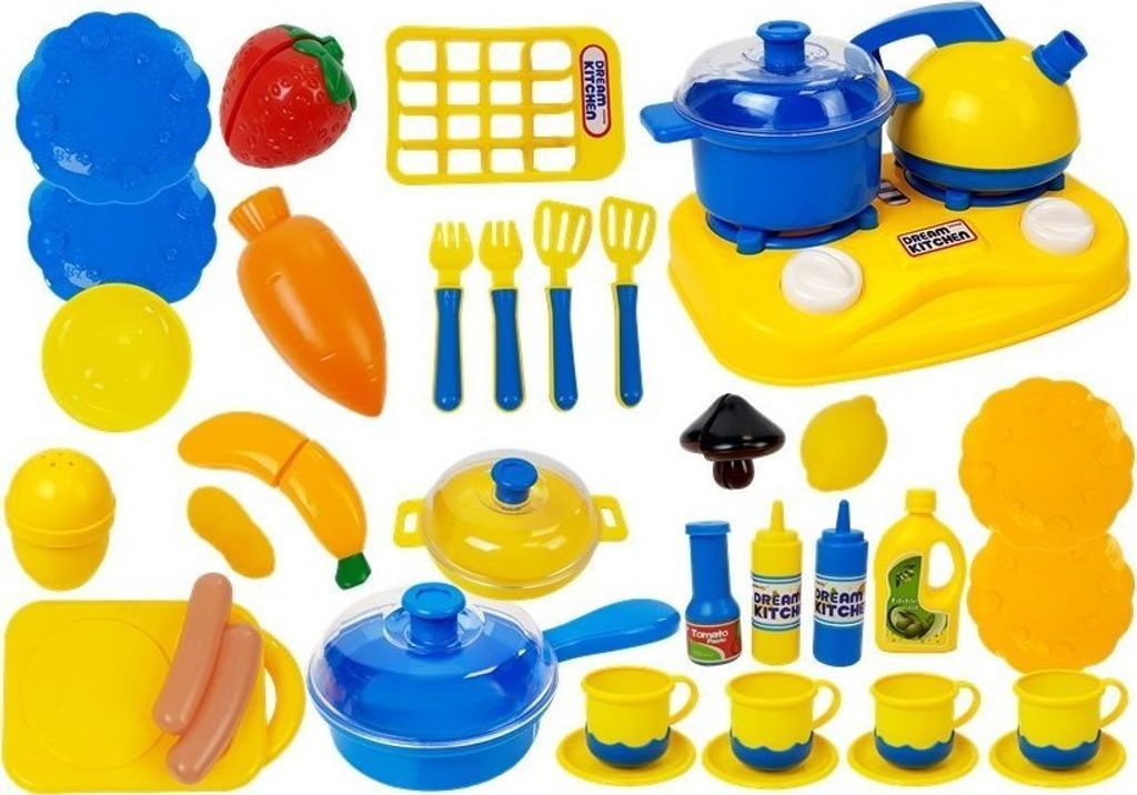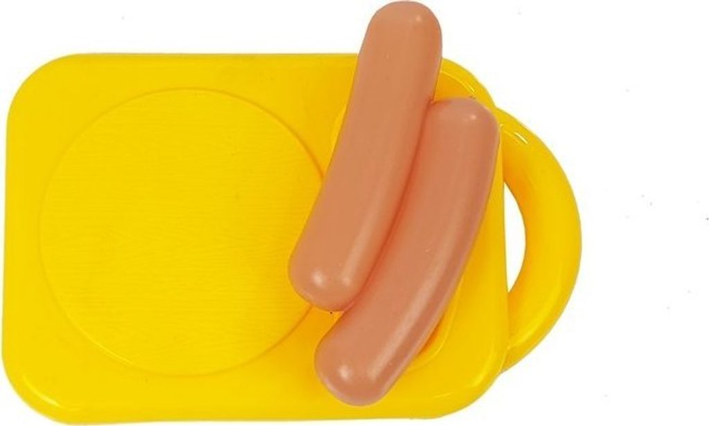 - sporák - kuchyňská váha - prkénko - 4 šálky s podšálky -varná konvice - solnička - rendlík - hrnec - pánev se dvěma uchy - 3 poklice - talíř - košík - hrnek - příbory: 2 nože, 2 vidličky, 1 lžíce - 2 špachtle - potravinářské výrobky: párky, vejce, banán (na suchý zip), kukuřice (na suchý zip), jahoda (na suchý zip), houby (na suchý zip), mrkev, citron, arašídy - kečup, olej, 2 omáčky v láhvi