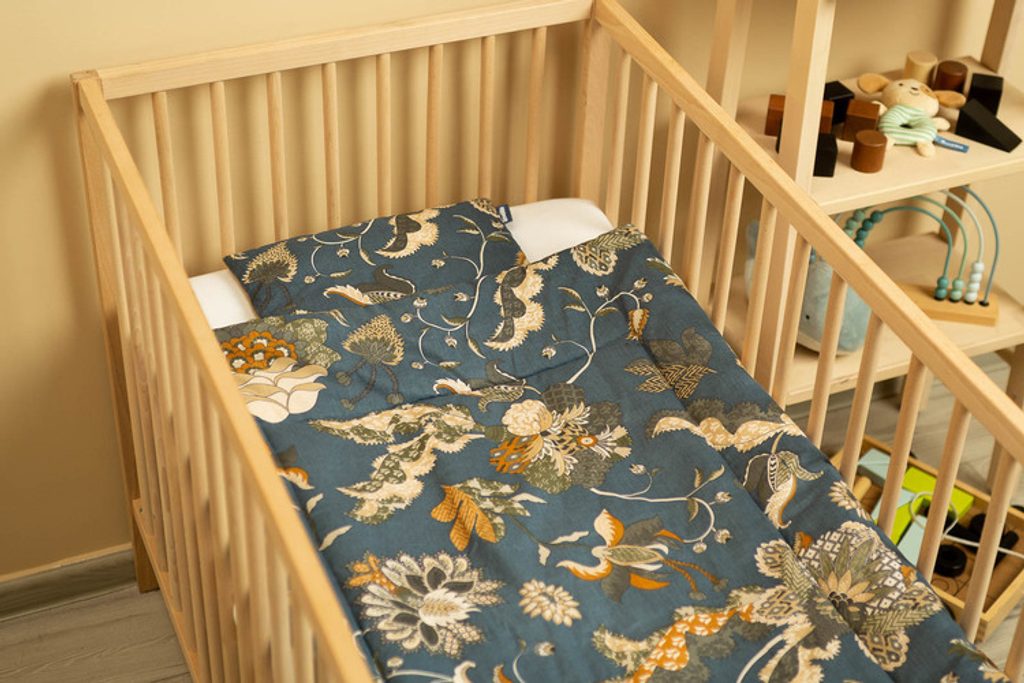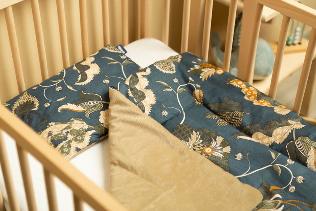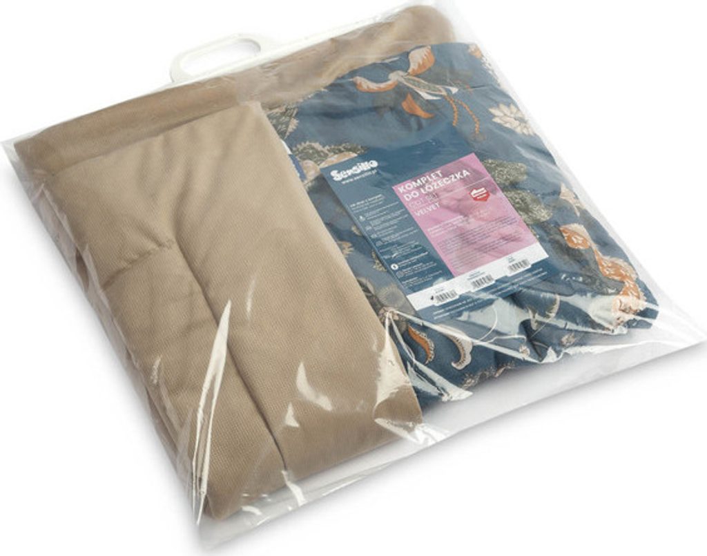Souprava do postýlky je z jedné strany vyrobena z kvalitní, barevné bavlny a z druhé strany ze sametu příjemného na dotek. Skládá se z plochého polštáře a peřiny s antialergickou výplní. Měkká látka příjemně pohladí každé miminko.