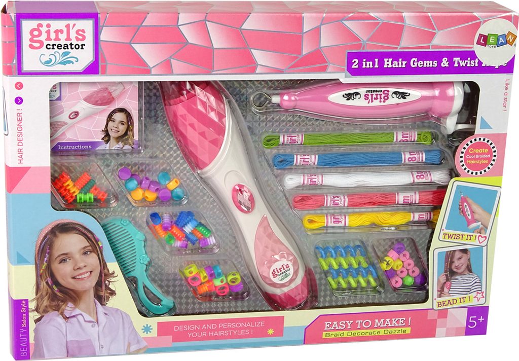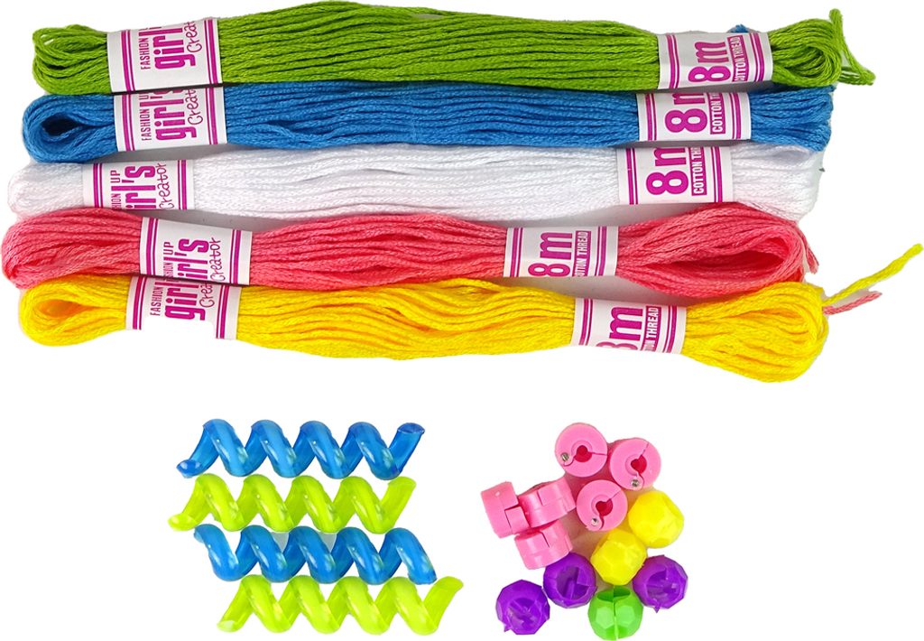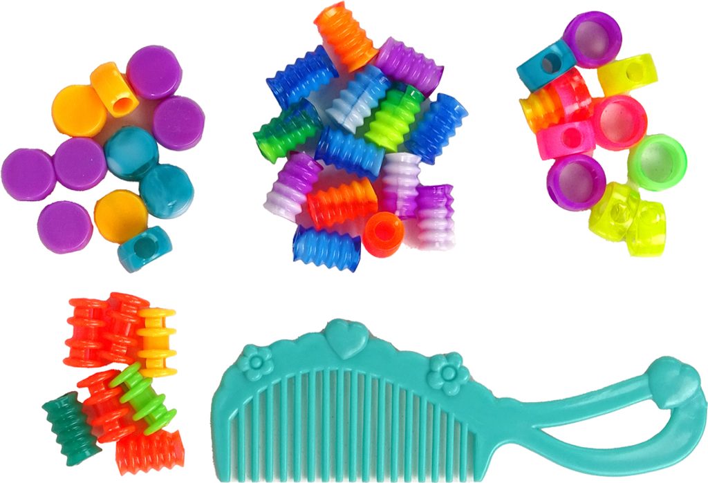 Sada obsahuje nepřeberné množství korálků v odstínech růžové, žluté, fialové, zelené, modré a oranžové, které otevírají nekonečné možnosti tvoření. Pět osmimetrových bavlněných nití v zelené, modré, bílé, růžové a žluté barvě vám umožní vytvářet různé styly. Dodává se také s modrým hřebenem do vlasů pro pohodlí.