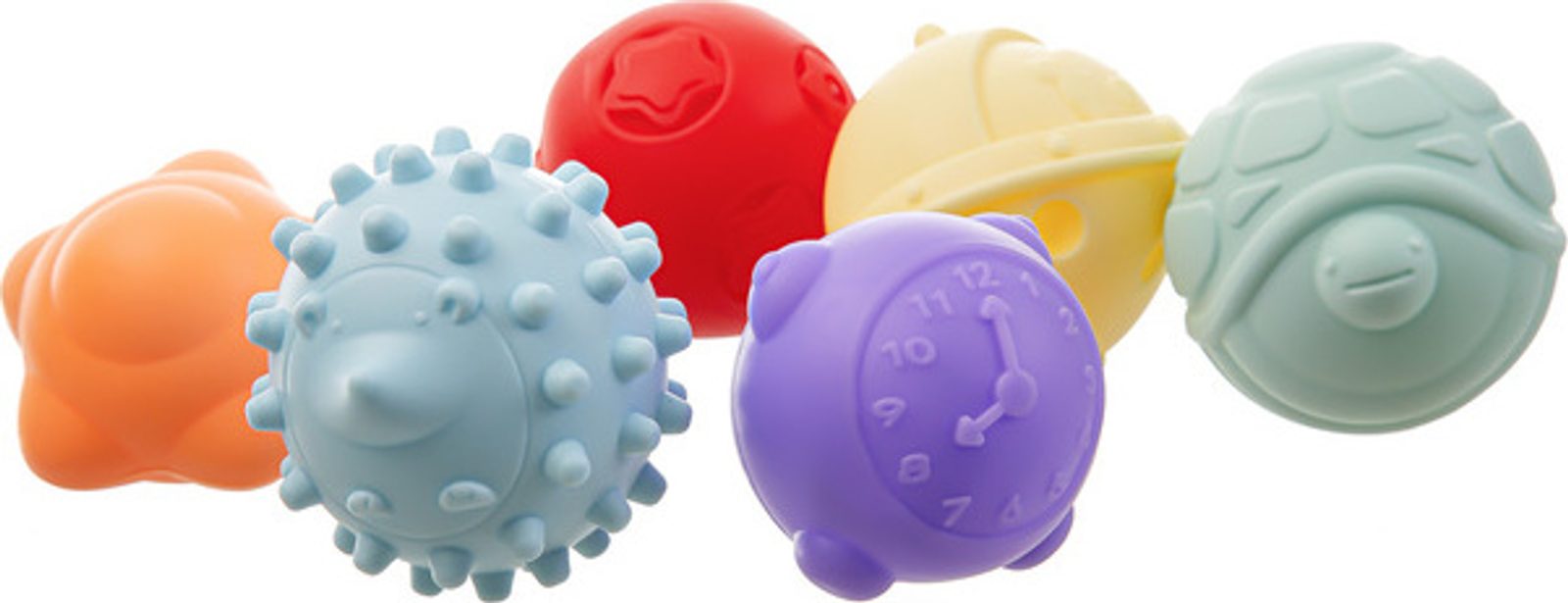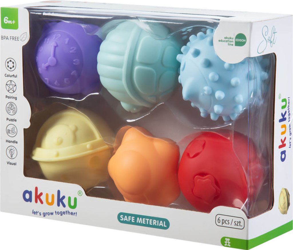 Sada "měkkých" senzorických míčků je navržena tak, aby stimulovala hmat a kinestetické vjemy. Míčky lze použít k terapeutickým a vzdělávacím účelům nebo jako smyslové hračky pro děti. Senzorické míčky se vyznačují měkkostí, tvarem, strukturou a barvou. Používají se při senzorické terapii, která se často uplatňuje u dětí s různými smyslovými poruchami, jako je autismus nebo ADHD. Fungují jako nástroj pro stimulaci smyslů a pomáhají při smyslové integraci. Díky různým texturám poskytuje každý míček dítěti jiný smyslový zážitek. Bohaté barevné provedení rozvíjí smysly dítěte a rozmanité tvary a figurky, podporují batole v kreativní hře. Při stisknutí jednotlivých prvků se ozve zvuk, který malé batole ještě více zaujme. Kuličky od "akuku" probouzejí kreativitu, stimulují představivost a vizuální vnímání a rozvíjejí manuální dovednosti.