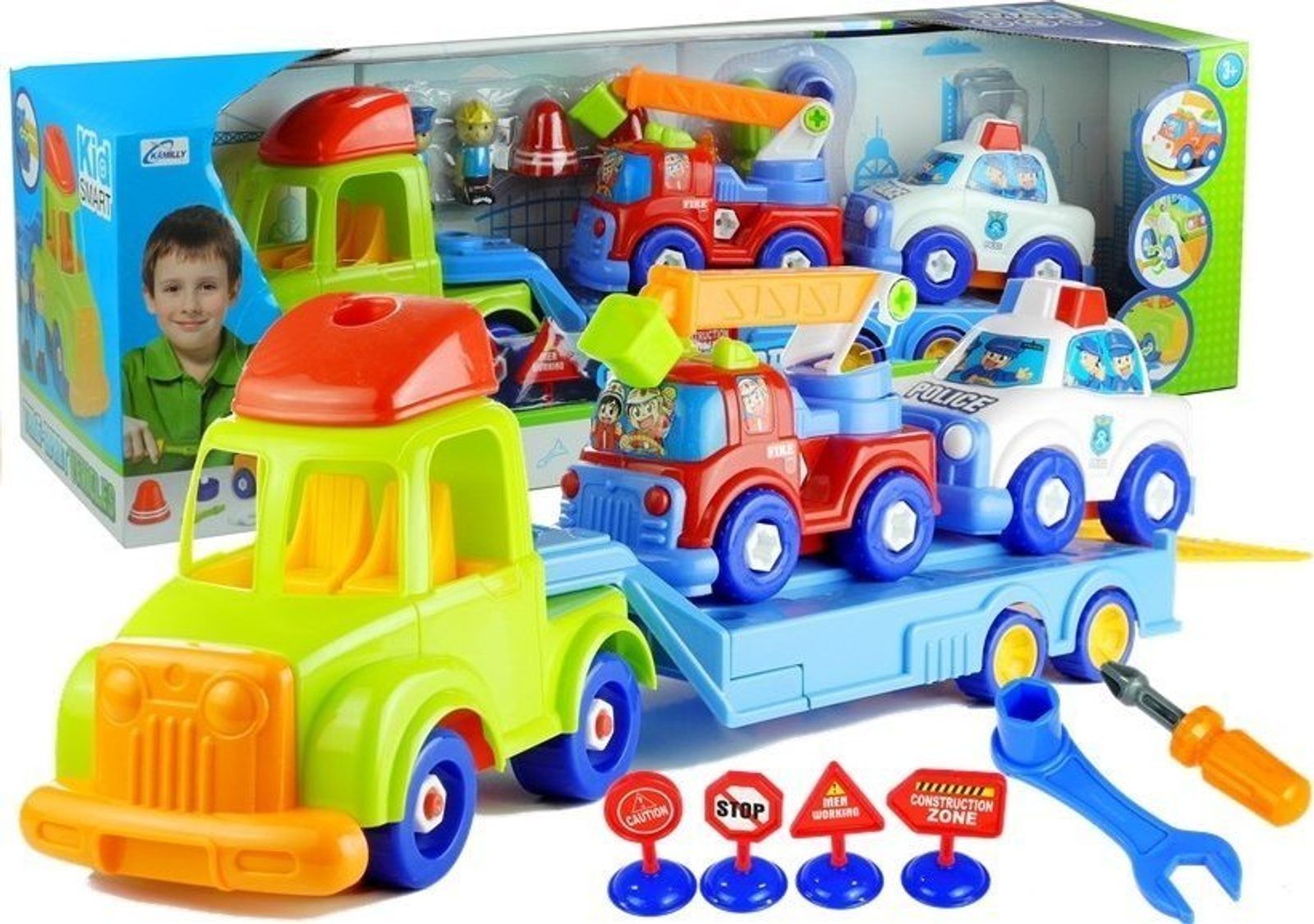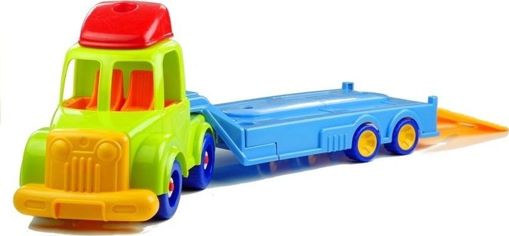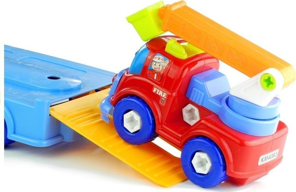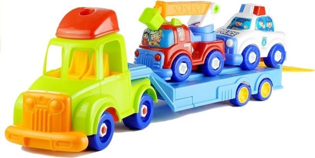 Vícebarevný přívěs pro přepravu automobilů se skládá ze dvou částí: kabiny řidiče s otvory na místě oken, což umožňuje umístit do ní řidiče a spolujezdce, a také z rozloženého přívěsu. Zábavné auto je posazeno na 4 párech otočných kol, díky čemuž si dítě může s touto hračkou hrát na mnoho způsobů. Autíčko má prvky, které jsou připevněny velkými plastovými šrouby, které může dítě s pomocí plastových šroubováků s vyměnitelnými konci, které jsou součástí sady, odšroubovat a upravit tak vozidlo. Na automobilovém přepravním přívěsu jsou umístěna dvě, menší auta - policejní auto a hasičské auto. Hasičské auto má pojízdné a otočné prvky, které dokonale zpestří zábavu. Vozidla jsou ozdobena samolepkami cestujících a také charakteristickými nápisy. Intenzivní, živé zbarvení ve spojení s uhlazenými, příjemnými tvary dodává této hračce velmi veselý charakter.