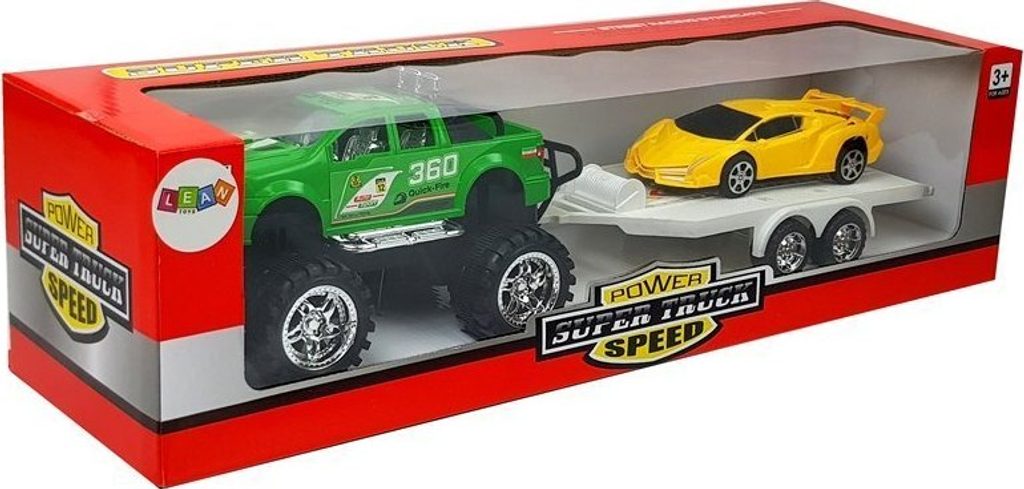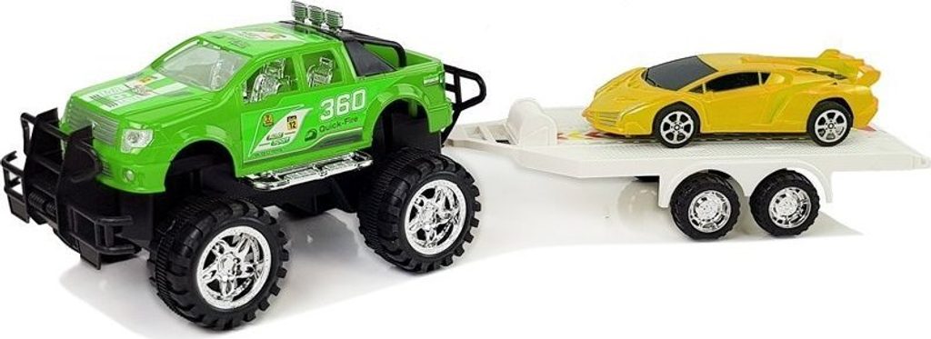 Terénní auto s odtahovým vozem, na kterém se přepravuje krásný žlutý sporťák, jistě poskytne nezapomenutelnou zábavu s vrstevníky a podnítí vaše dítě ke kreativní hře. Větší auto má třecí pohon, stačí zatáhnout a pustit, sledovat, jak se řítí vpřed.