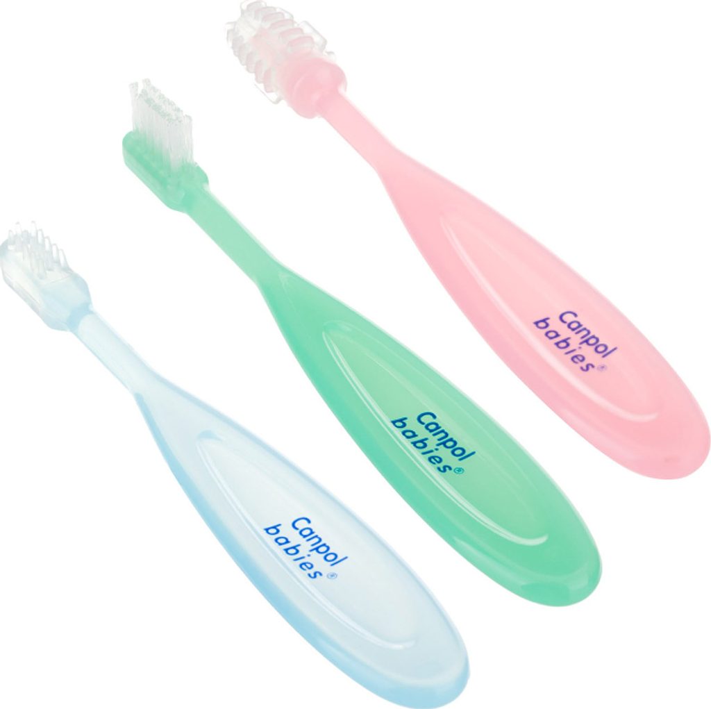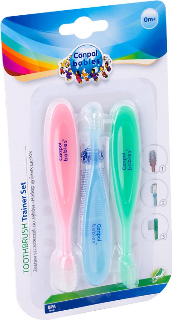 Sada zubních kartáčků Canpol Babies - 3 ks. Sada tří zubních kartáčků je určena k péči o dásně a první zoubky dítěte. Sada se skládá ze tří kartáčků: kartáčku na masáž dásní pro děti, které ještě nemají zoubky; silikonového kartáčku na mytí prvních zoubků; klasického kartáčku s měkkými štetinami pro starší děti.