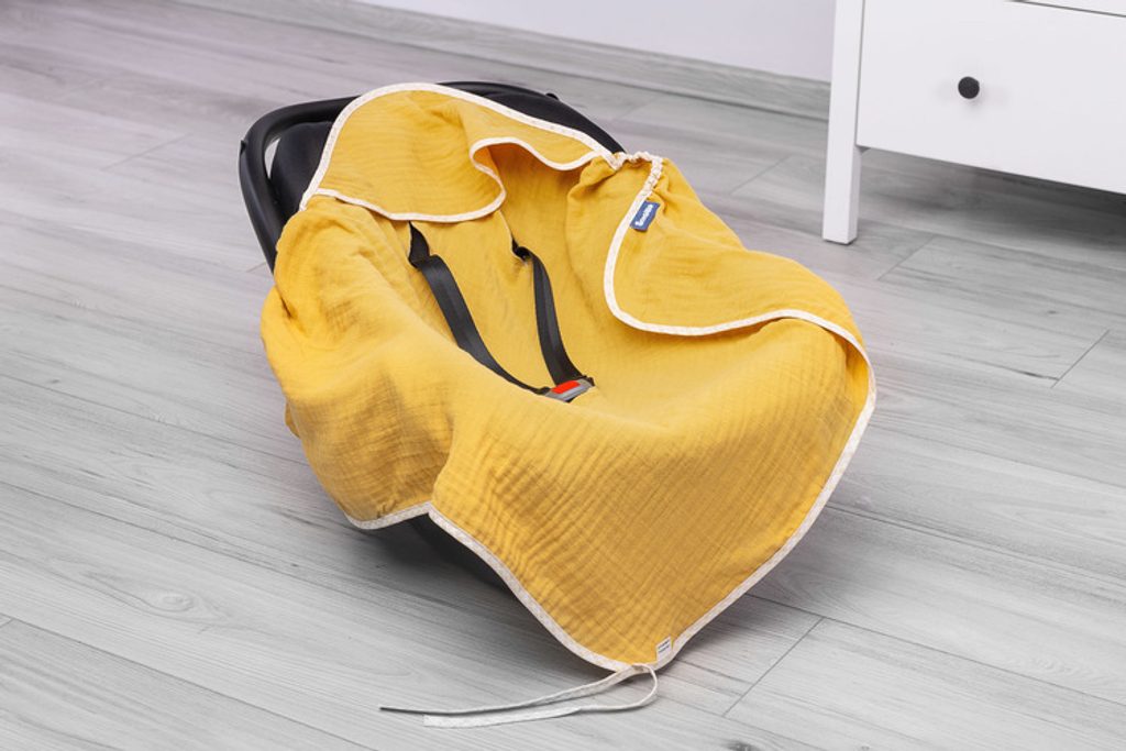 Mušelínová zavinovačka chrání před sluncem, větrem a hmyzem. Díky své lehkosti a prodyšnosti zabraňuje přehřátí dítěte. Dá se použít i jako přikrývka. Látka příjemná na dotek zajistí vašemu dítěti pohodlí na cestách. Vyrobeno z 100% bavlny. Má otvory pro 3-bodové pásy.