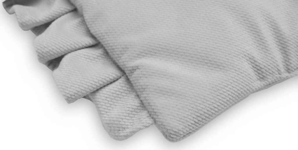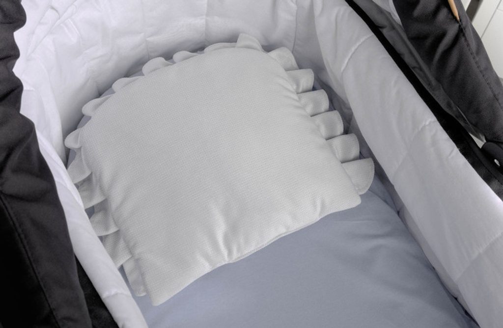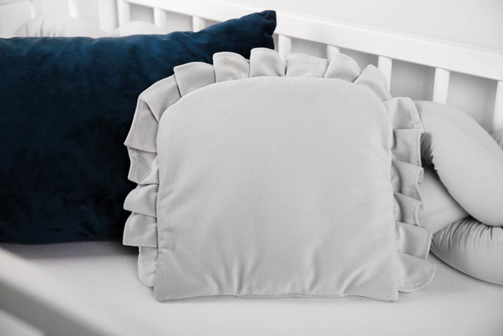Sametový polštář s volánem zajistí dobrý spánek doma i na cestách. Skvěle se hodí do kočárku, postýlky nebo jako polštářek na podložení hlavičky miminka. Je vyrobena ze sametové látky příjemné na dotek, výplň tvoří antialergická silikonová netkaná textilie. Tyto materiály nebudou dráždit jemnou pokožku dítěte. Polštář je plochý, ideální i pro novorozence.