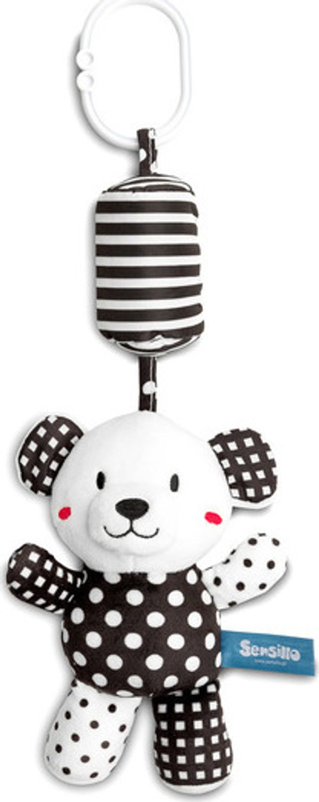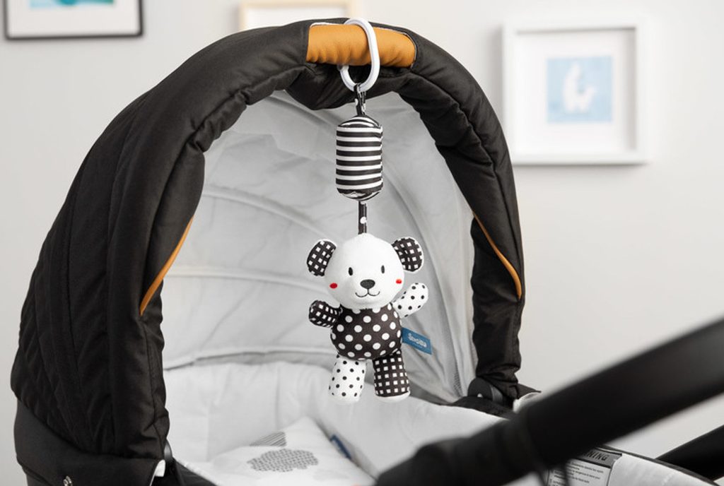 Plyšový přívěsek na kočárek Black & White kravička upoutá pozornost dítěte nejen charakteristickou černobílou barvou, ale také zvonkem příjemným pro ucho. Maskot má univerzální držák, který umožňuje připevnění kdekoli, doma nebo na cestách. Další zábavou pro miminko jsou šustící ouška a pískot ukrytý v bříšku.
