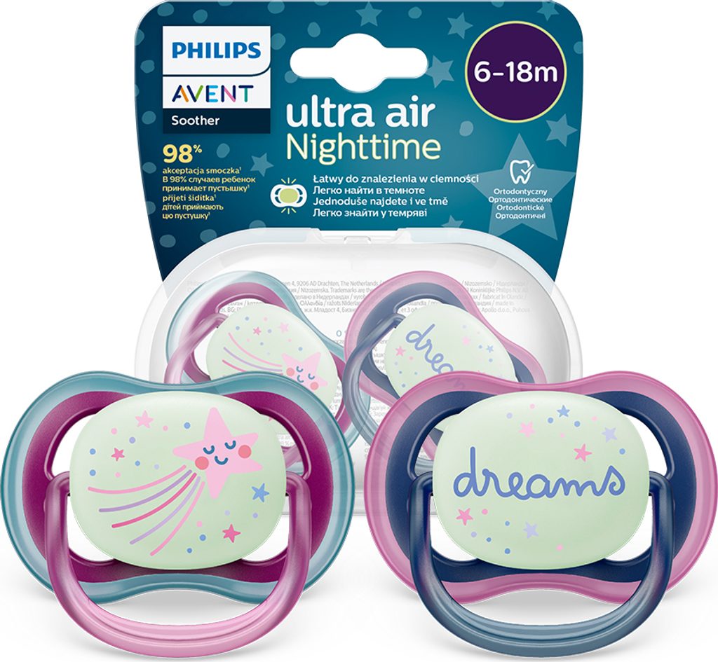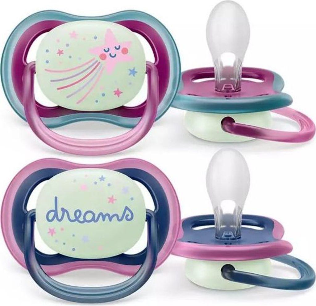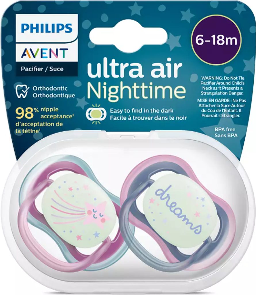 Uklidňující a proudící vzduch. Dudlík Philips Avent Ultra Air má extra velké otvory, které pomáhají udržet vaši pokožku v suchu. Tlačítko svítící ve tmě usnadňuje nalezení, i když je světlo vypnuté. Dostupné v různých barvách a vzorech.