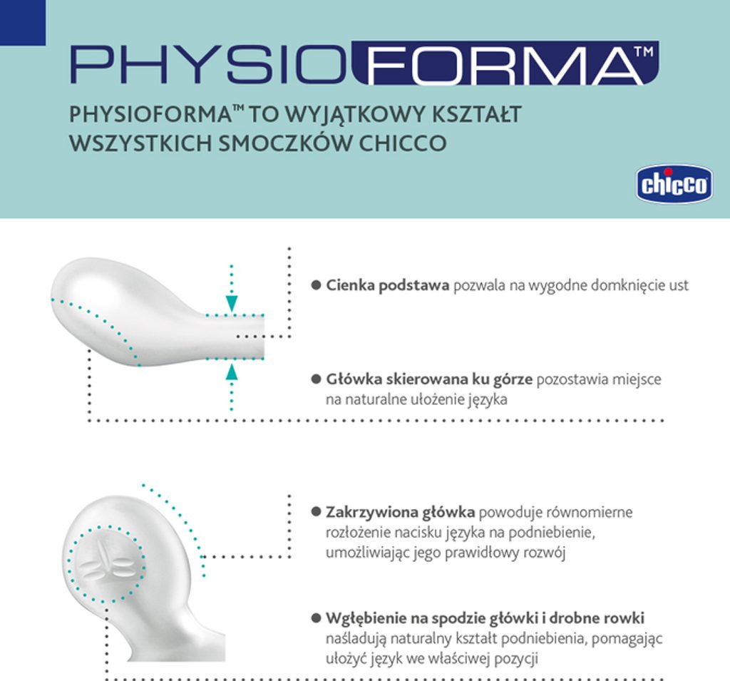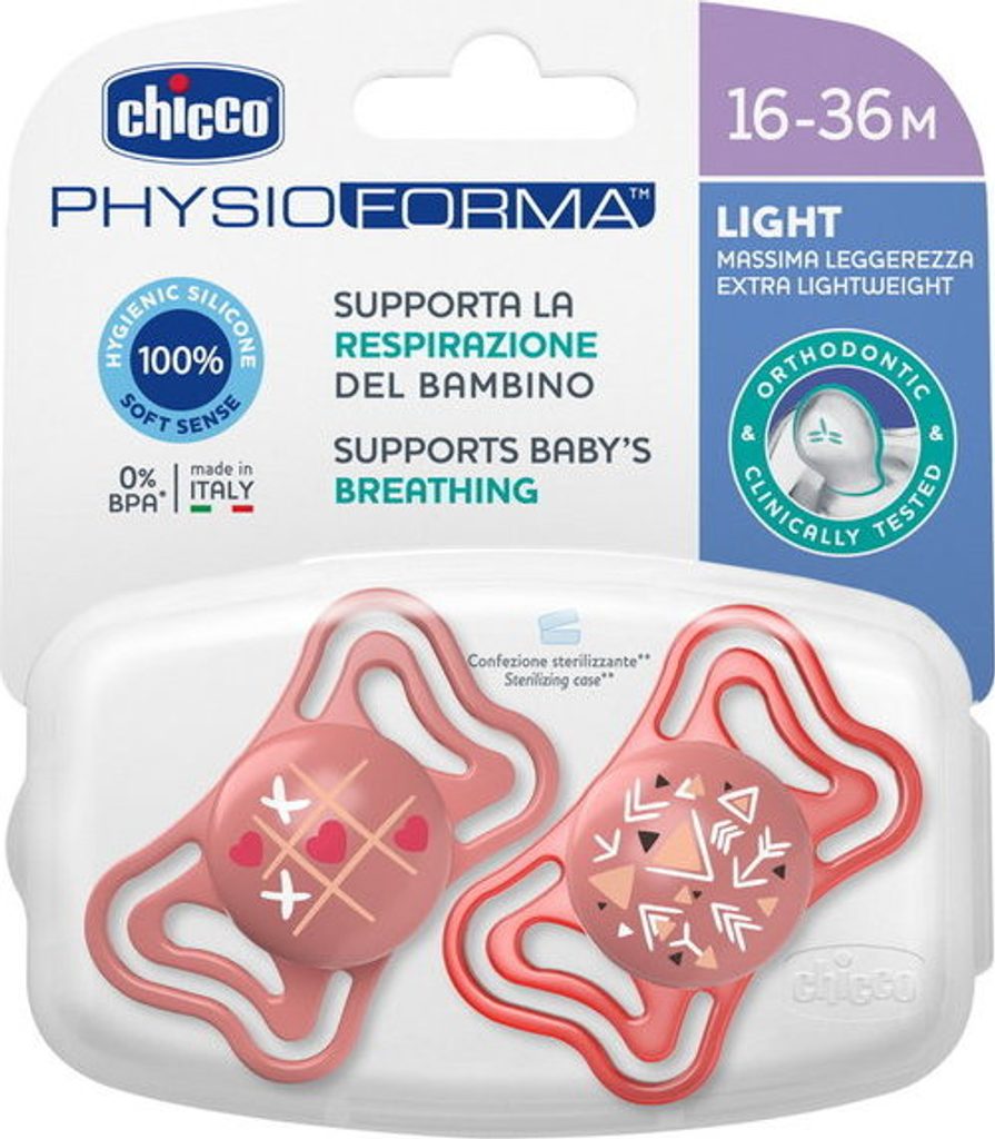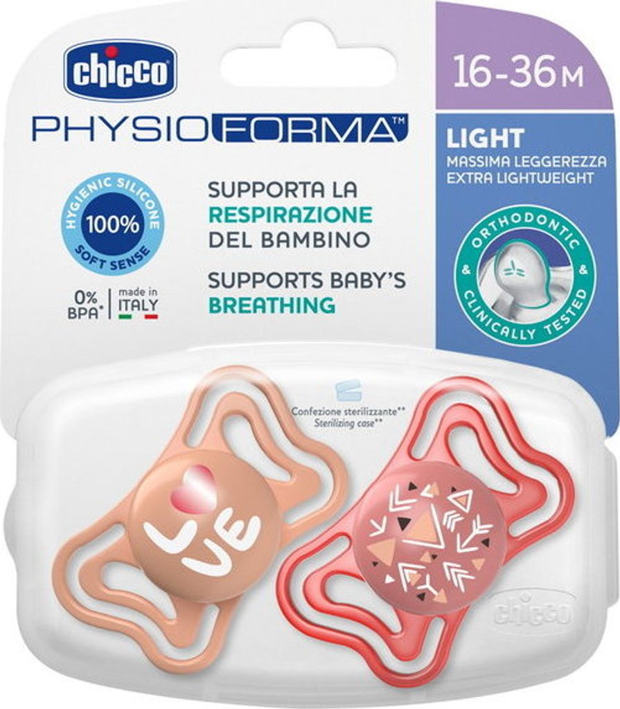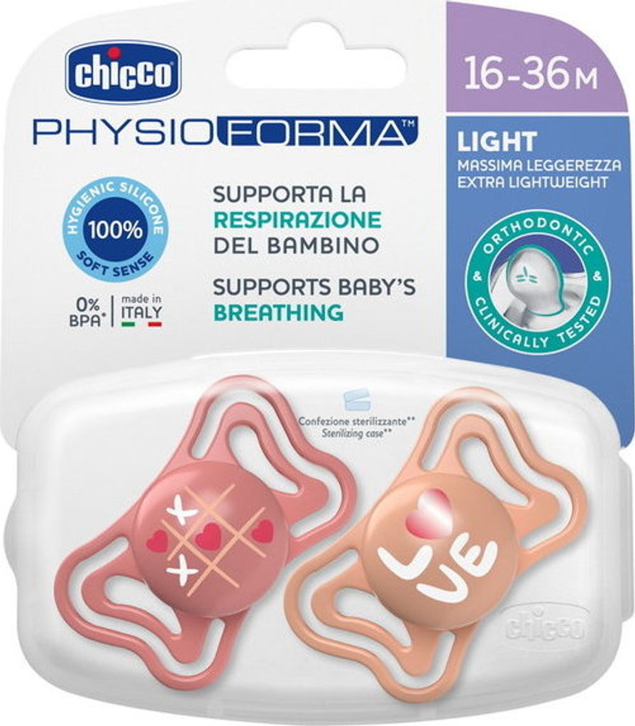 PhysioForma Light je nejlehčí dudlík z řady Chicco.Je vyroben ze silikonu a má extra měkký a sametový povrch SOFTSENSE. Podporuje správný vývoj úst a zajišťuje dostatečnou cirkulaci vzduchu.