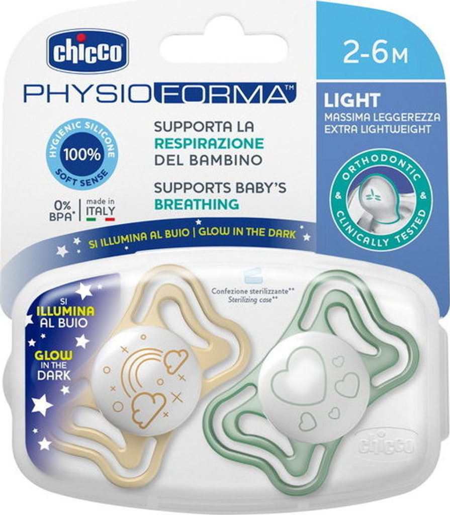 PhysioForma Light je nejlehčí dudlík z řady Chicco. Je vyroben ze silikonu a má extra měkký a sametový povrch SOFTSENSE. Podporuje správný vývoj úst a zajišťuje dostatečnou cirkulaci vzduchu.