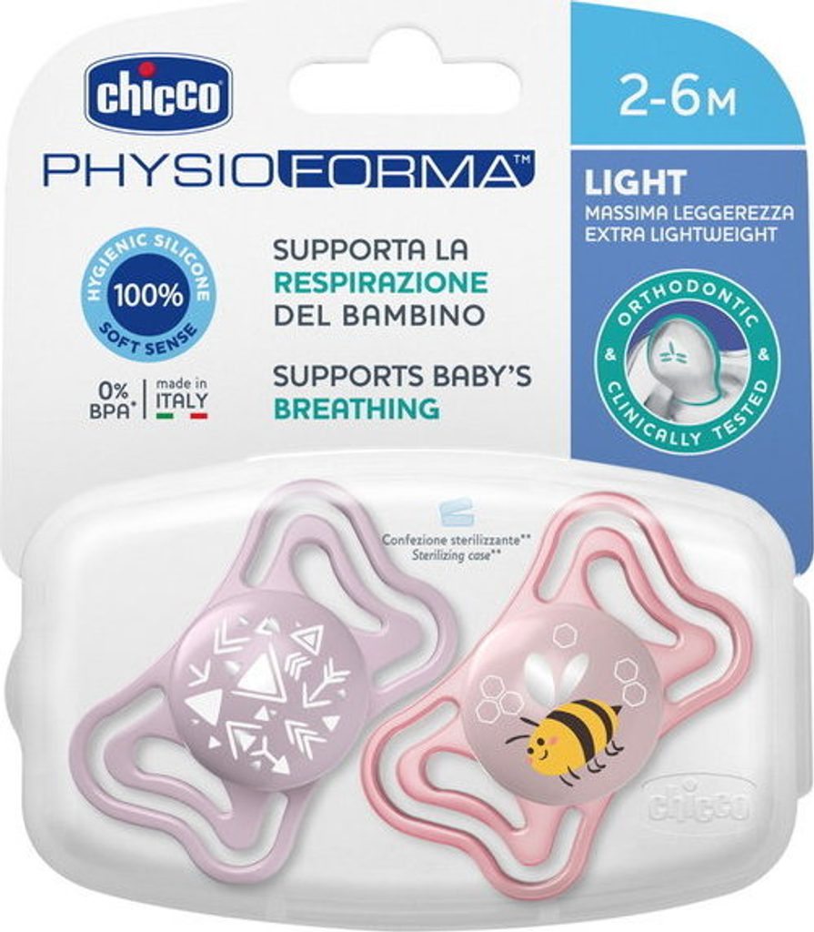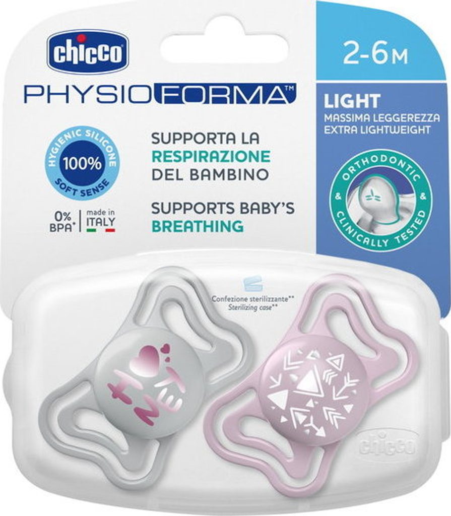 PhysioForma Light je nejlehčí dudlík z řady Chicco.Je vyroben ze silikonu a má extra měkký a sametový povrch SOFTSENSE. Podporuje správný vývoj úst a zajišťuje dostatečnou cirkulaci vzduchu.
