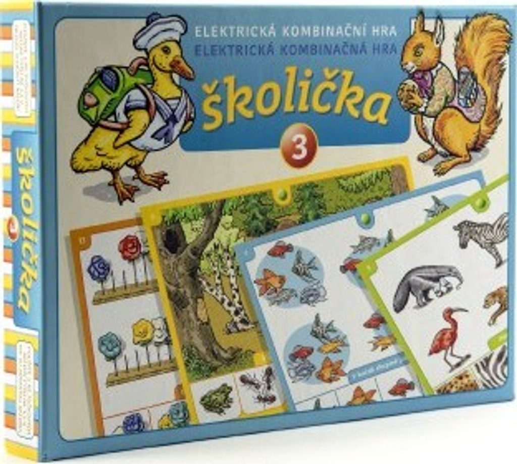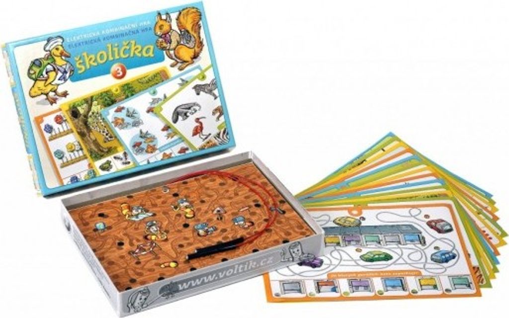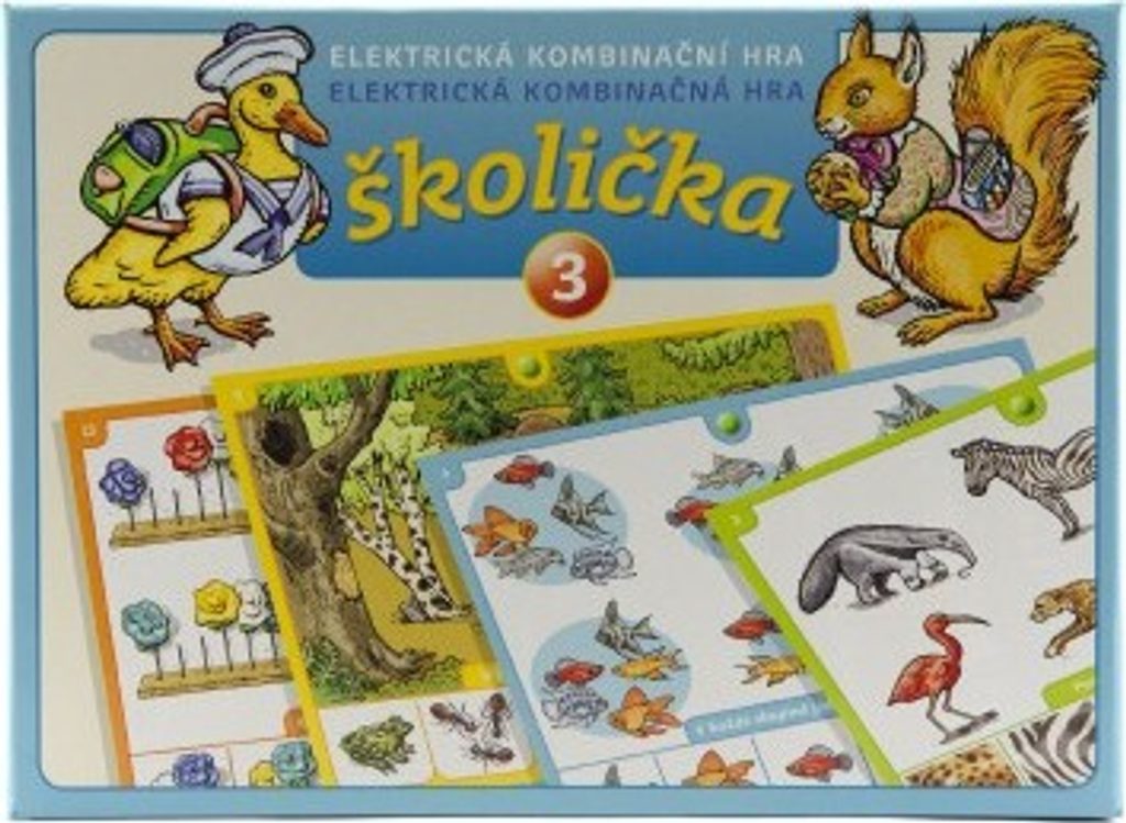 Školička 3. Elektronické testovací tabulky jsou určeny k osvojování a testování předškolních a školních znalostí hravou formou. Správnou odpověď na otázku signalizuje rozsvícené zelené světélko elektronického obvodu. Po výběru otázky dítě zvolí odpověď a její správnost si ověří tak, že se dotkne jedním testovacím kolíkem kontaktní plošky u otázky a druhým kolíkem plošky u odpovědi. Pokud je odpověď správná, rozsvítí se zelené světélko. V opačném případě, zůstane světélko zhasnuto.