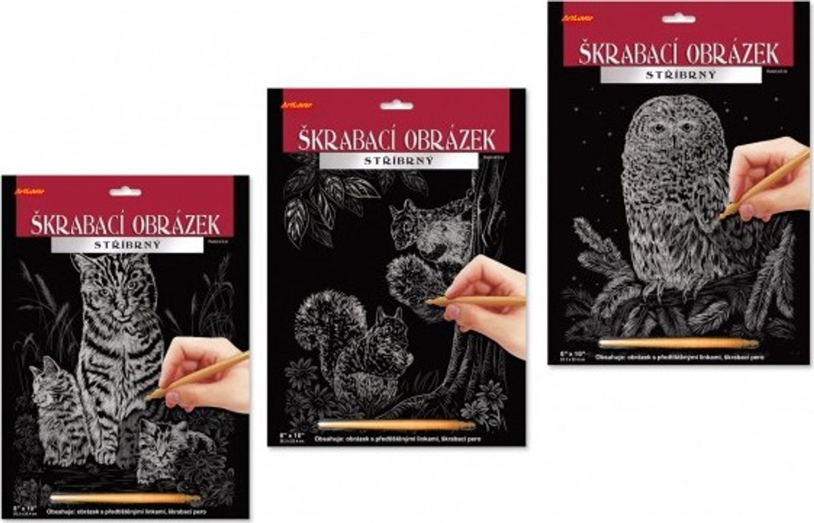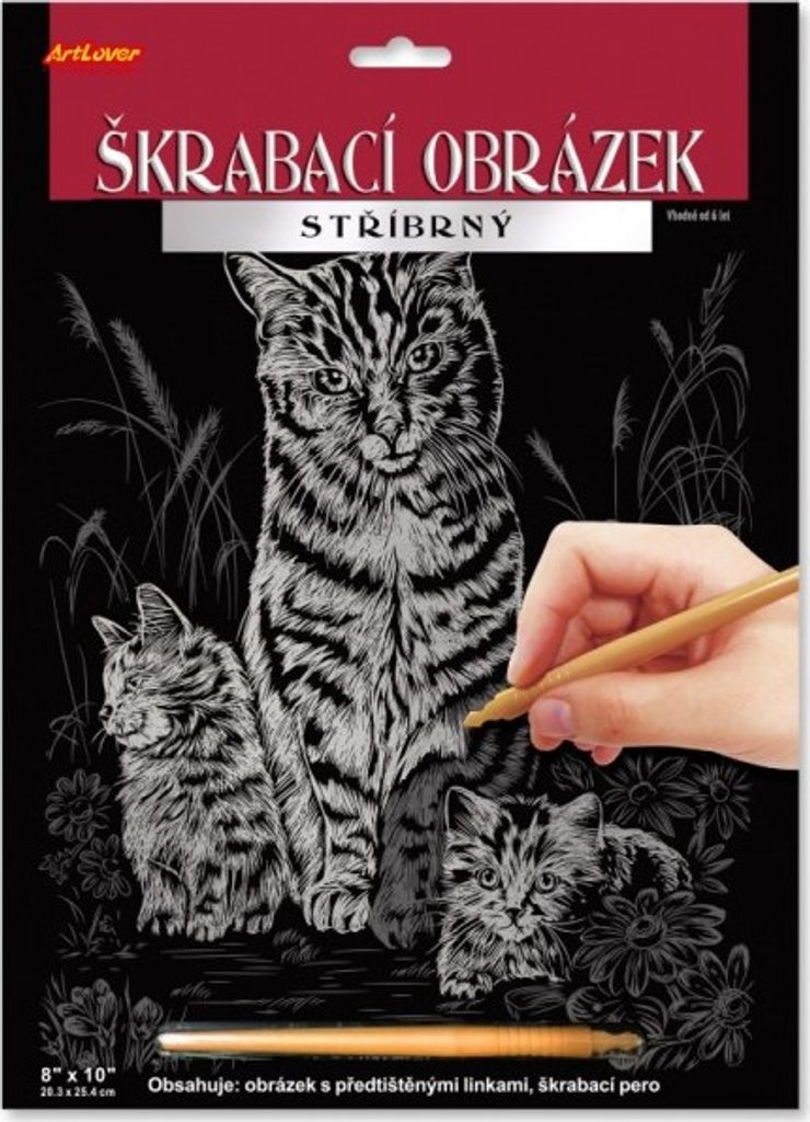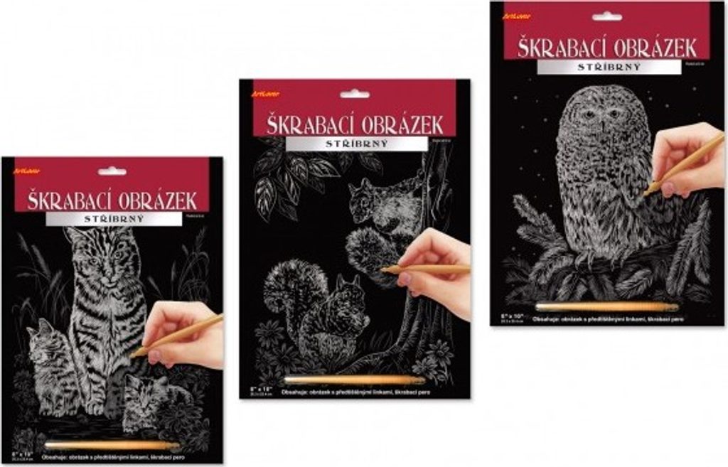 Sada obsahuje obrázek natištěný na černém kartonu a umělohmotné škrabací pero. Seškrabte předtištěné linky a objevíte obrázek, který se hezky leskne z různých úhlů pohledu. Na výběr ze 3 druhů obrázku. MIX varianty zboží odesíláme náhodně. Jestliže si přejete určitou variantu, napište nám poznámku v posledním kroku objednávky. Pokud bude varianta dostupná, odešleme dle vašeho požadavku.