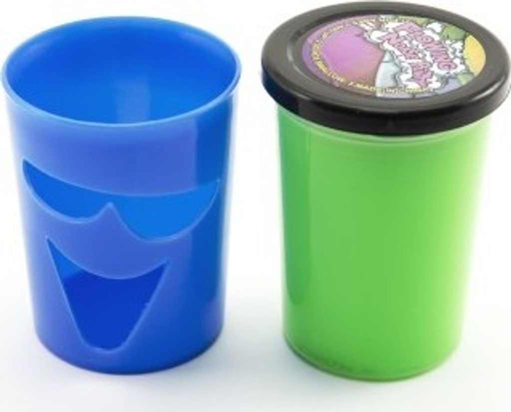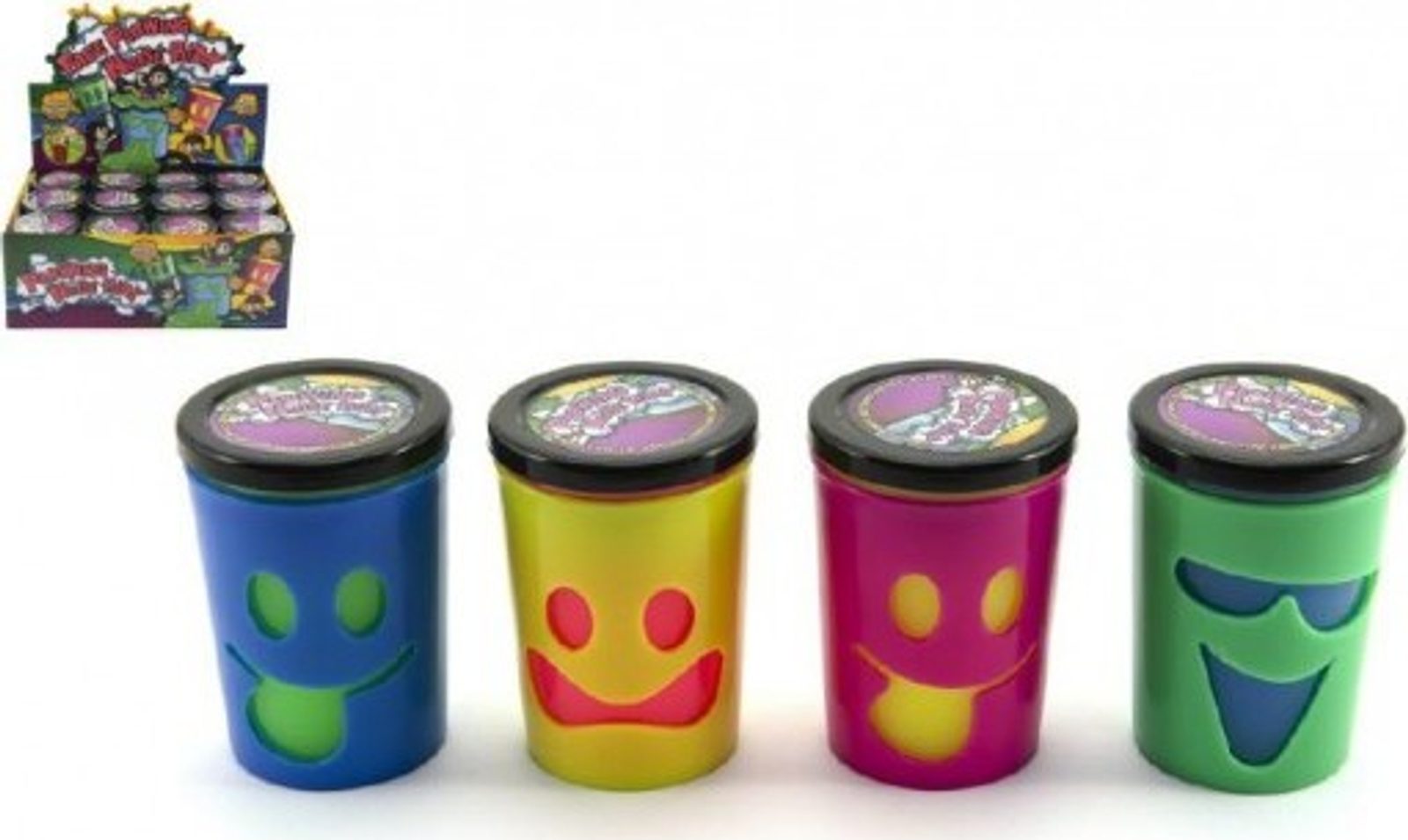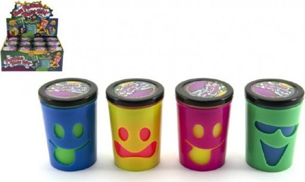 Sliz v kelímku s obličejem prdící. Kelímek můžete použít k legráckám se slizem. Zmáčkněte sliz v kelímku a proteče Vám otvory a navíc vydává vtipné zvuky.
