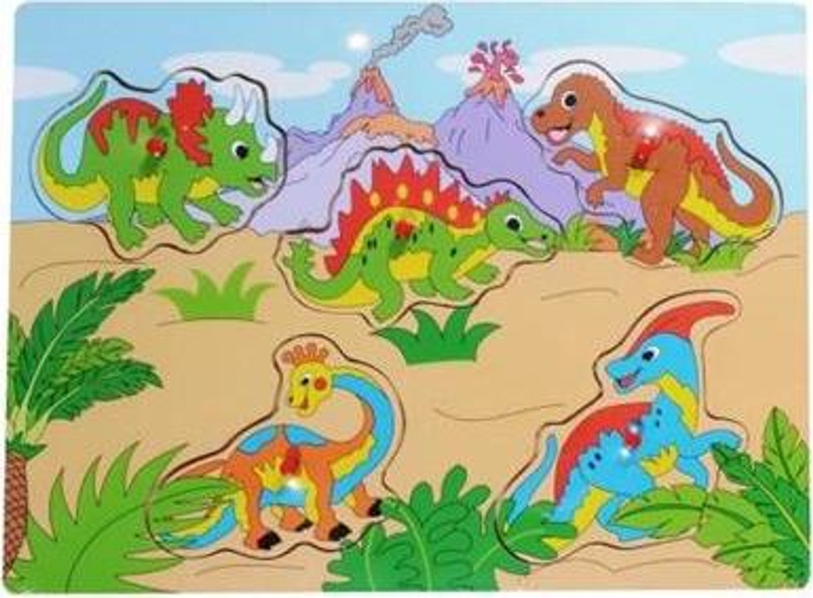 Dřevěná skládačka - úchytky s obrázkem dinosaurů. Rozvíjí u dětí představivost. Puzzle podporuje: • Rozvoj kognitivních dovedností • Rozpoznávání obrázků, tvarů a barev. Věk: 18M+ Rozměry produktu: 30 x 22 x 1 Bezpečnost: CE