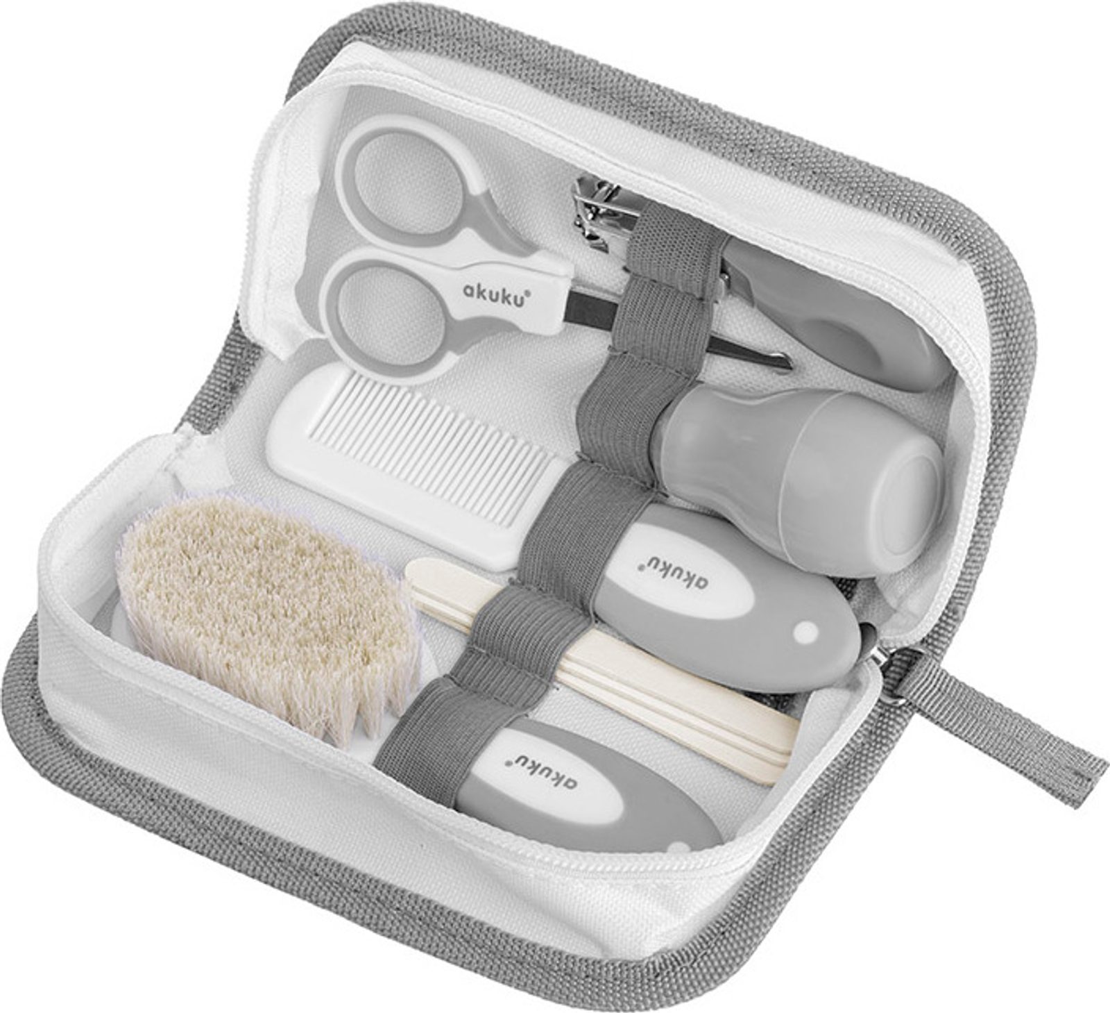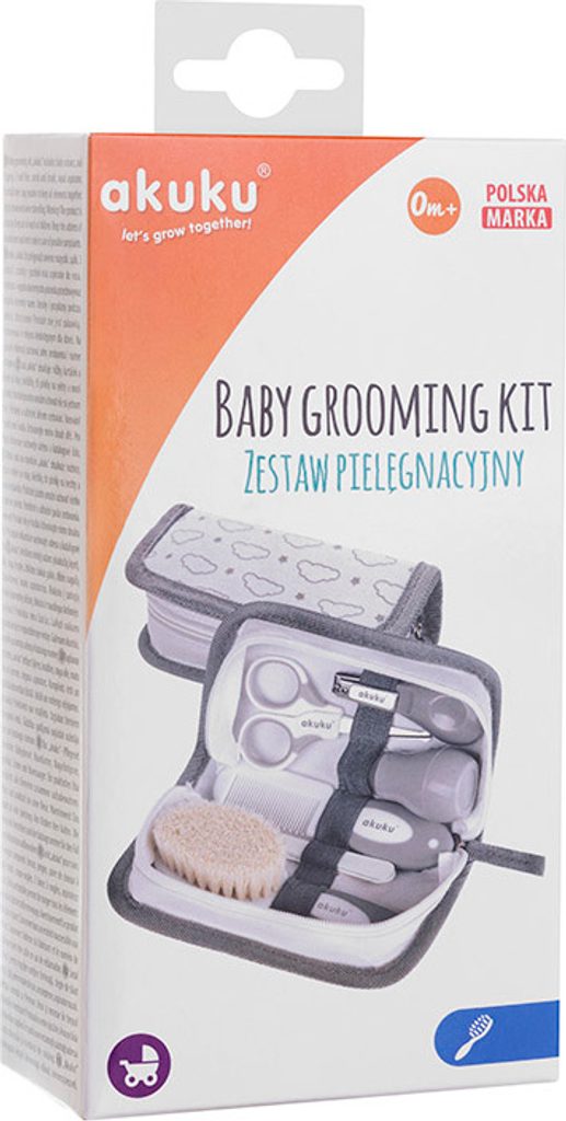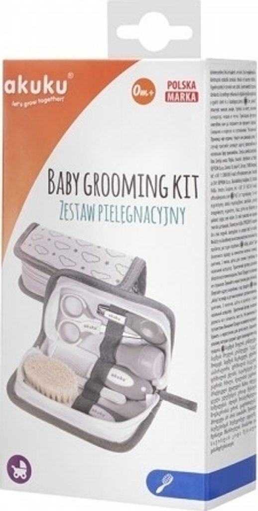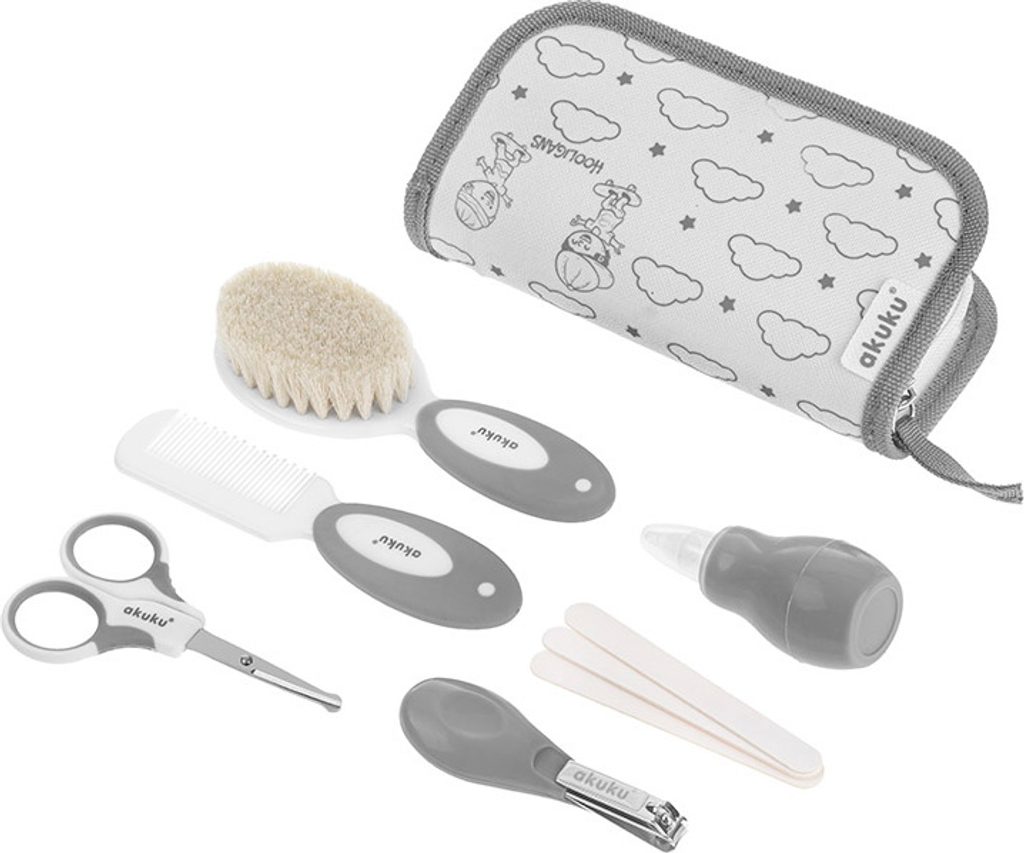 Sada pro péči o vaše dítě v pohodlné a praktické kosmetické taštičce. Nůžky (s tenkými kovovými čepelemi a zaoblenými hranami) a kleště vám pomohou stříhat nehty bezpečně a bezpečně a pilník snadno odstraní nerovnosti nehtů a ochrání dítě před poškrábáním. O hlavičku vašeho miminka se postará měkký kartáček z přírodních štětin a hřebínek s protiskluzovou rukojetí. Hruška s měkkou špičkou je určena k pročištění dýchacích cest a odstranění vody a ušního mazu z dětských uší.