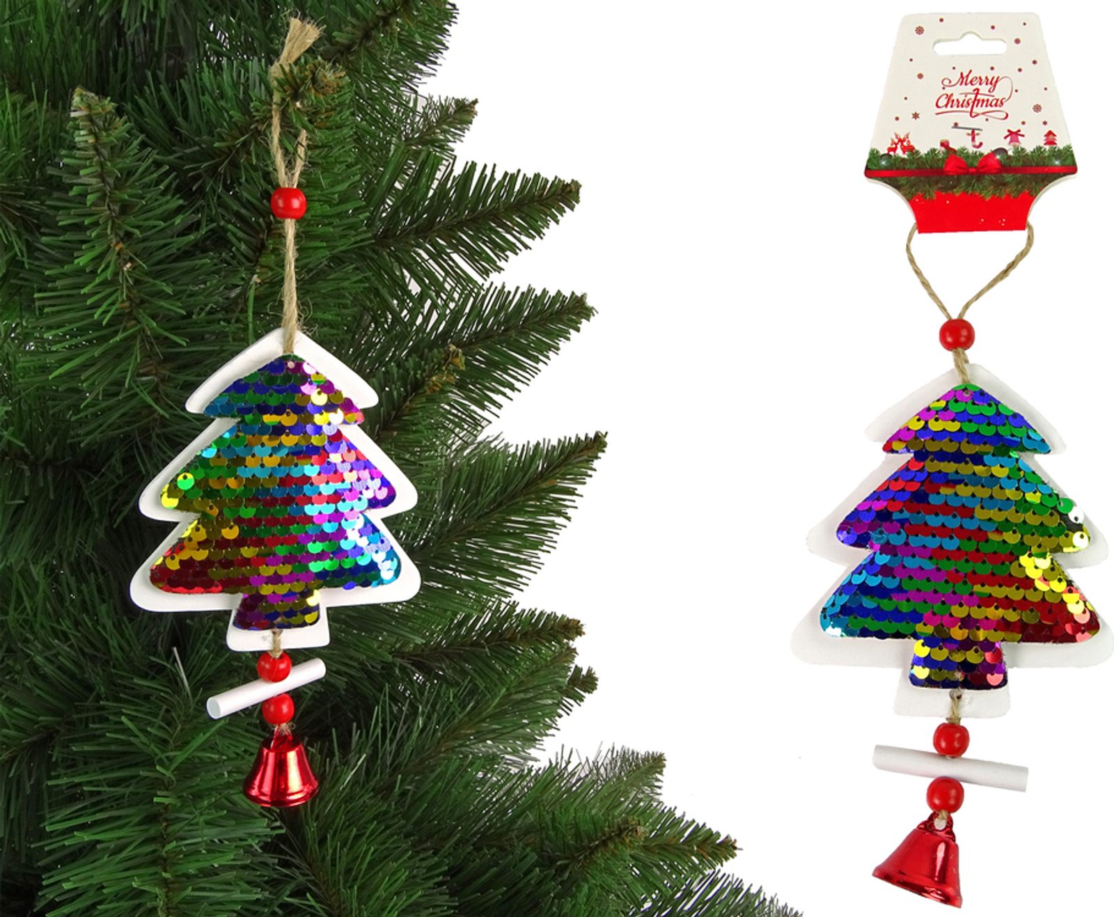 Ozdoba zobrazuje krásný strom s barevnými flitry.
