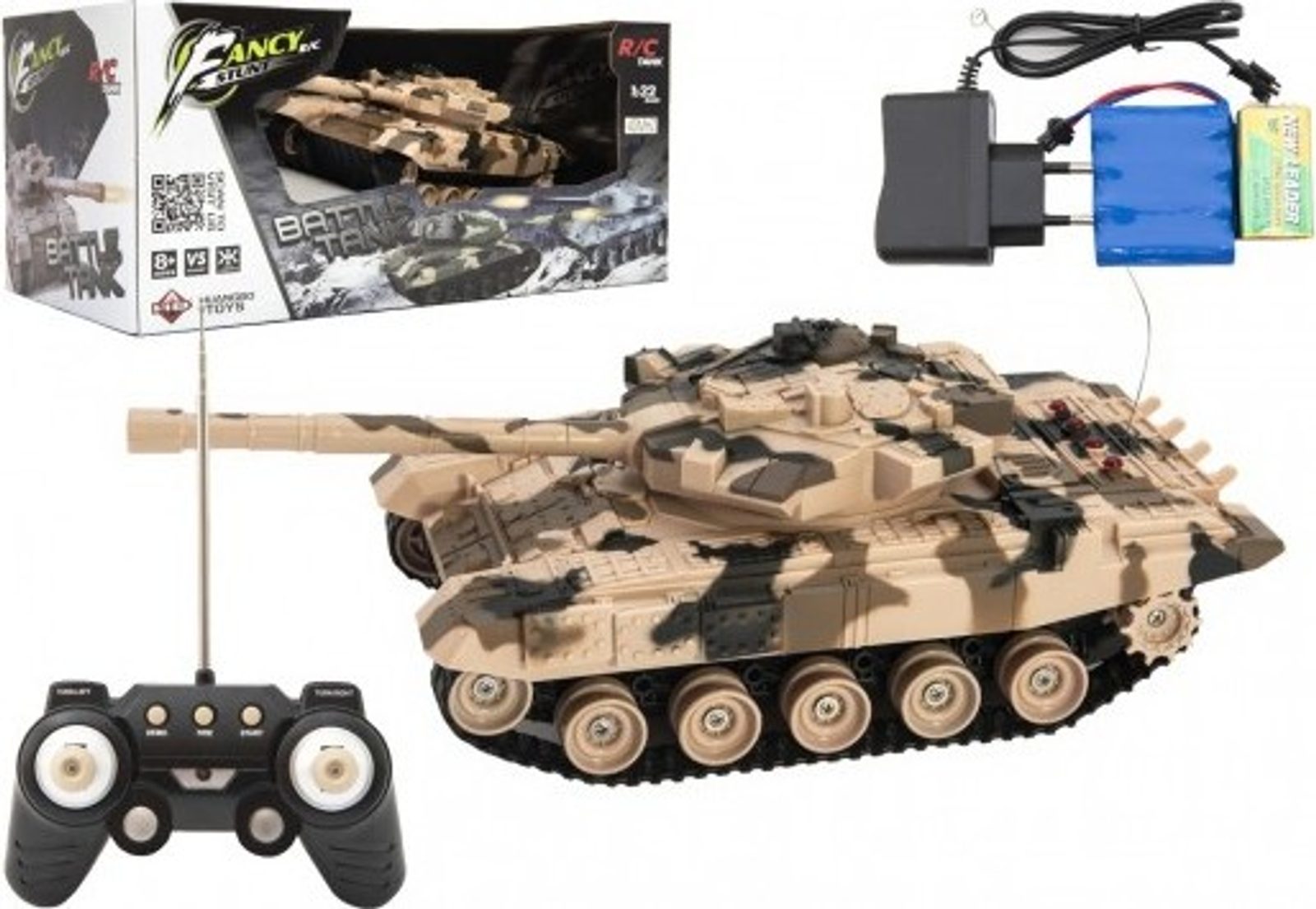 Tank vhodný pro tankovou bitvu. Tank vydává zvuky, střílí, otočná věž se otáčí o 360 stupňů, svítí. Kdo ztratí všechny "životy", prohrál. Hlaveň vydává zvuky. Tento tank pracuje na frekvenci 40 MHz. Vyrobeno z kvalitního a odolného plastu. Měřítko 1:32. Baterie 1x 4.8V AA (tank), 1x 9V (dálkové ovládání) jsou součástí balení. Vrhni se do válečné bitvy! Ovládej tank a hledej svého nepřítele! Vzdálenost dálkového ovladače do 15 metrů. Vzdálenost mezi tanky pro tankovou bitvu do 4 metrů. První doba nabíjení baterie je 8 hodin. Každé další nabíjení bude 3-4 hodiny do plného nabití baterie. Jeden plně nabitý dobíjecí pack vydrží 10-15 minut hry. Při nákupu druhého tanku, např. pro tankovou bitvu, musí být druhý tank na jiné frekvenci. Tzn. pokud máte tank na frekvenci 40 MHz, druhý tank musí být na frekvenci 27 MHz. Rozměry balení 37 x 17 x 19 cm. Vhodné pro děti od 8 let.