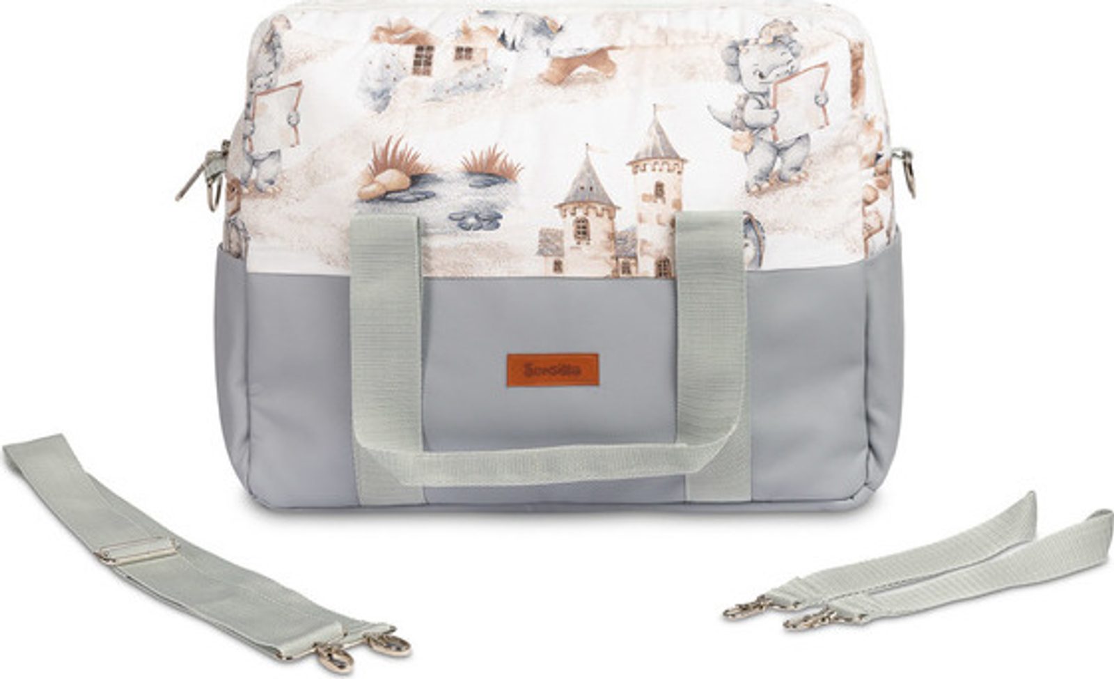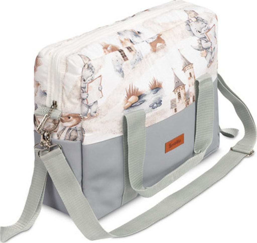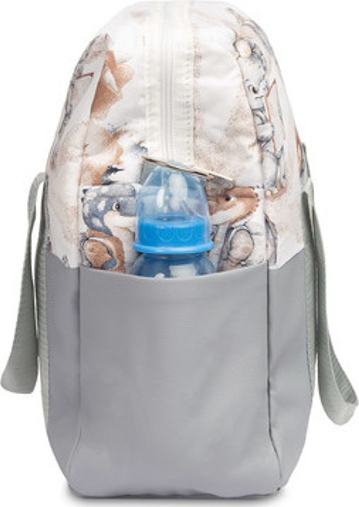 Taška z ekokůže je ideální nejen na kočárek. Má mnoho výhod, jako je dno z ekokůže, vnitřní kapsy, funkční přihrádky a podšívka odolná proti znečištění. Barevná bavlna s potiskem zase umožňuje, aby se taška hodila k moderním kočárkům. Kromě toho je taška vybavena kovovým kováním, univerzálními háčky pro zavěšení na rám a praktickým ramenním popruhem.