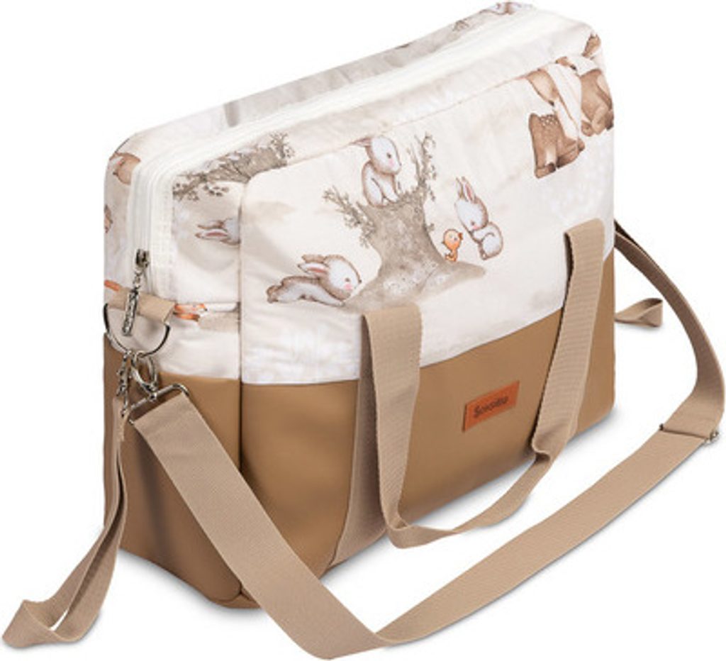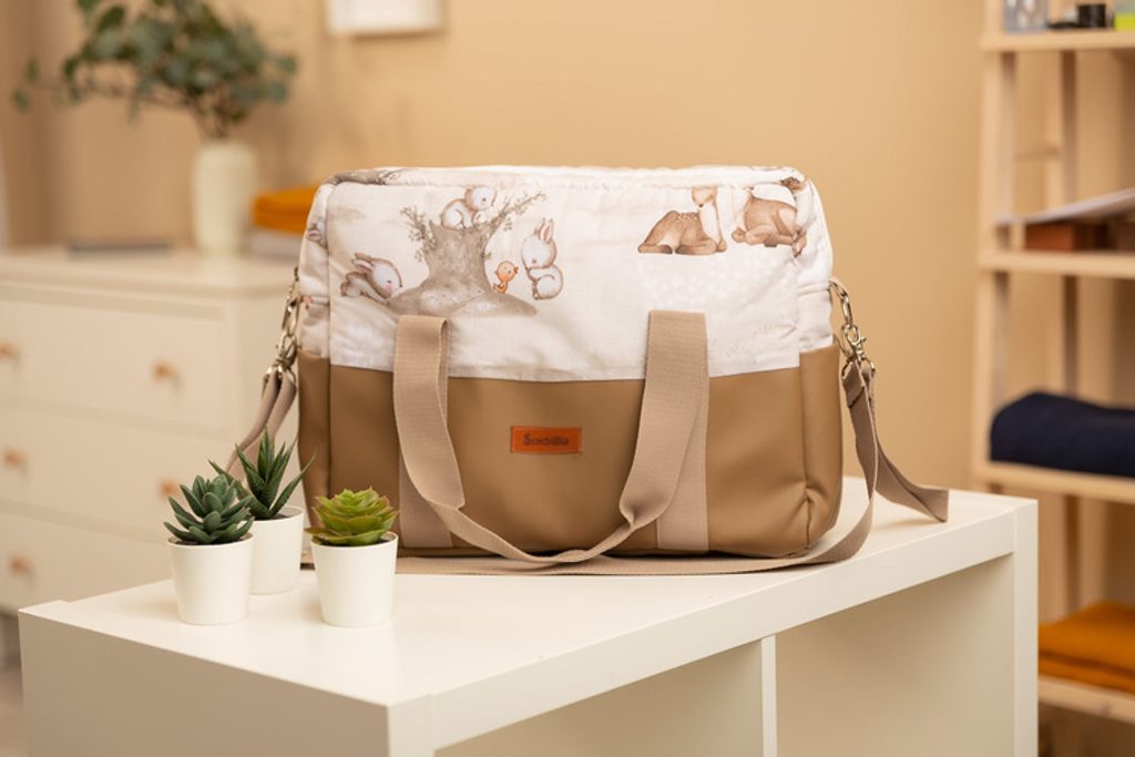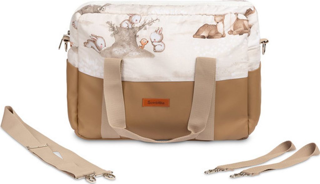 Taška z ekokůže je ideální nejen na kočárek. Má mnoho výhod, jako je dno z ekokůže, vnitřní kapsy, funkční přihrádky a podšívka odolná proti znečištění. Barevná bavlna s potiskem zase umožňuje, aby se taška hodila k moderním kočárkům. Kromě toho je taška vybavena kovovým kováním, univerzálními háčky pro zavěšení na rám a praktickým ramenním popruhem.