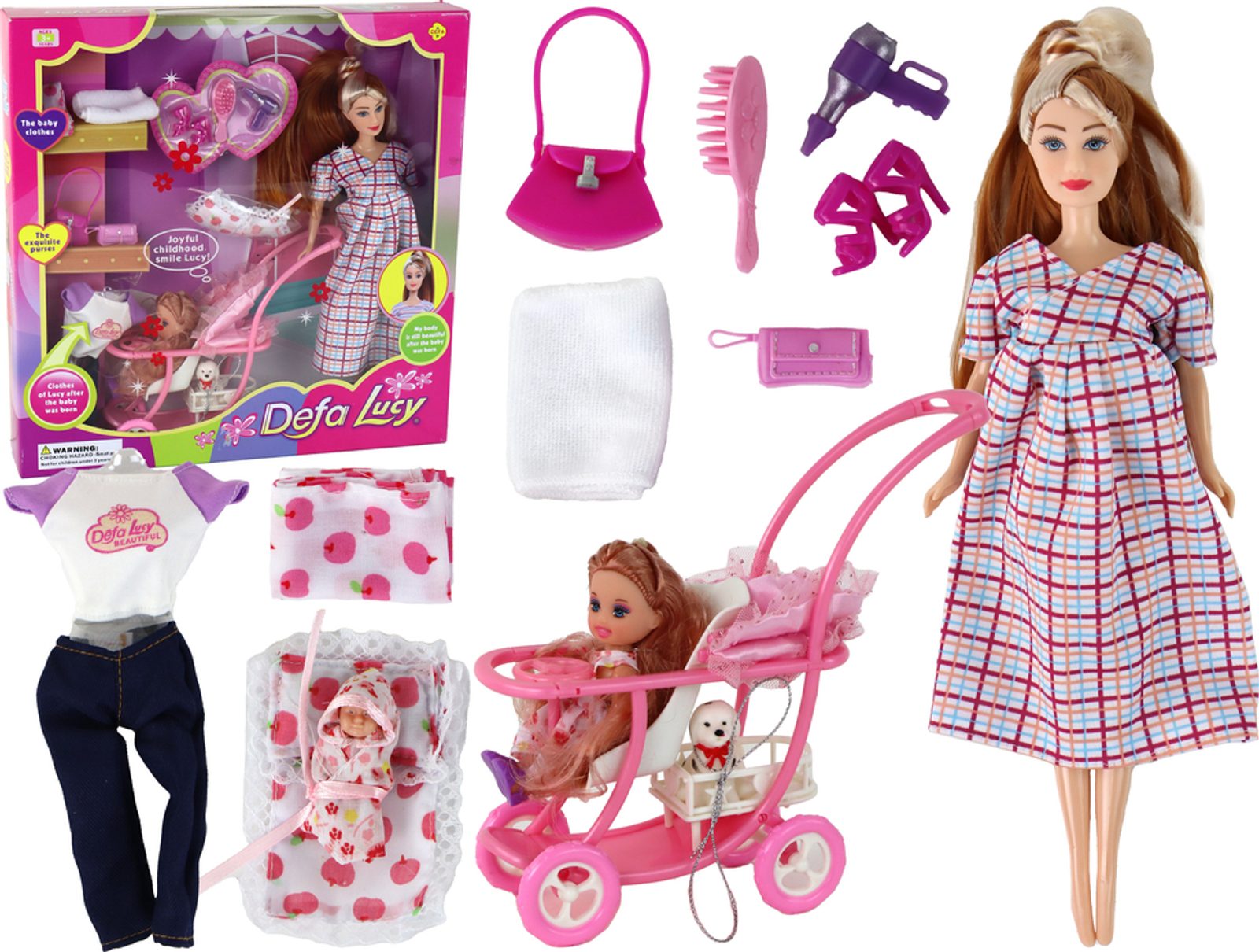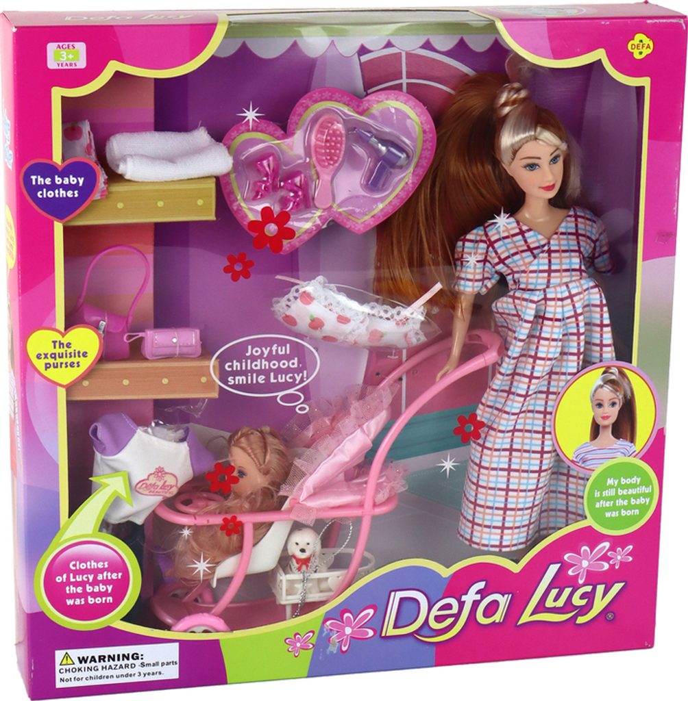 Růžový dětský kočárek s roztomilým pejskem vám umožní pohodlně vozit Lucy a její "děti" při procházkách a pejsek je věrným herním společníkem. Panenka pro holčičku, perfektní společník pro Lucy, se kterou můžete hrát rodinné a přátelské scénáře. Miminko v zavinovačce umožňuje dětem napodobovat péči o novorozence, což rozvíjí empatii a péči. Oblečení pro velkou panenku vám umožní změnit Lucyin styl v závislosti na příležitosti.