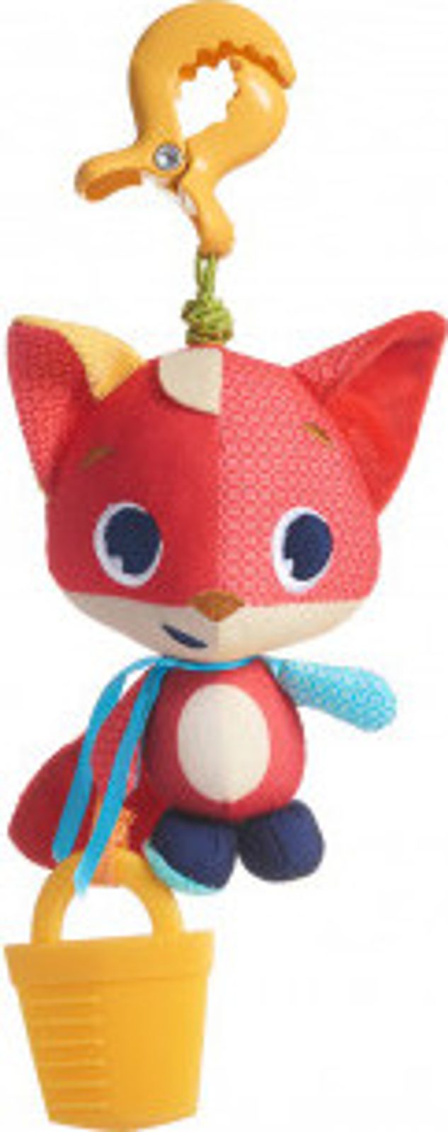 Měkká textilní hračka Tiny Love s plastovým klipem, která chrastí, šustí a po natažení vibruje.