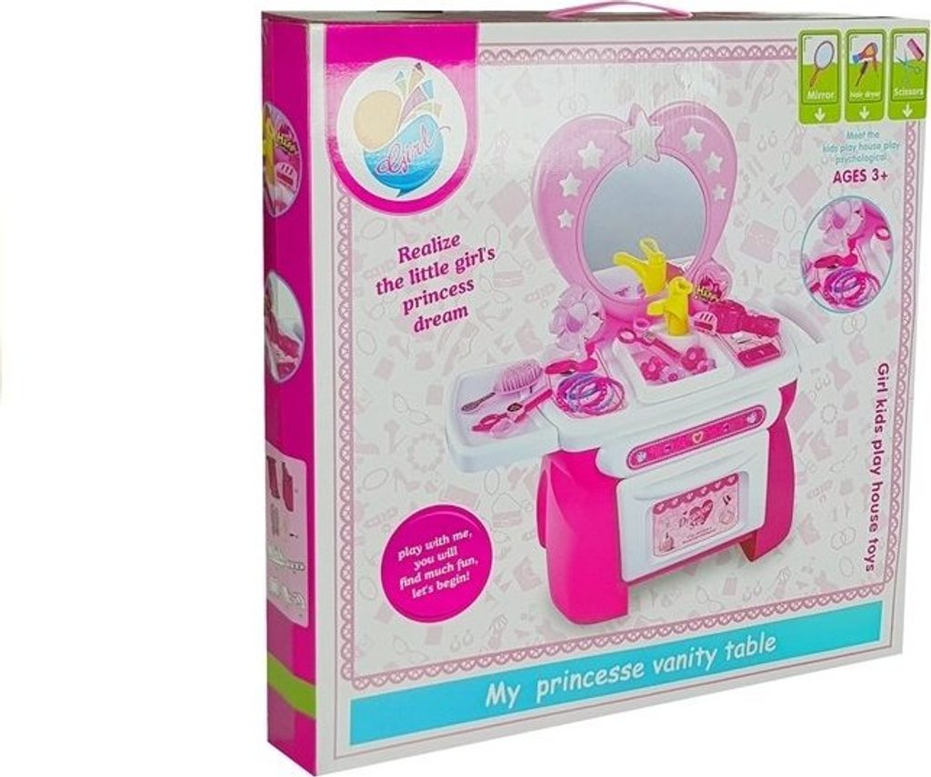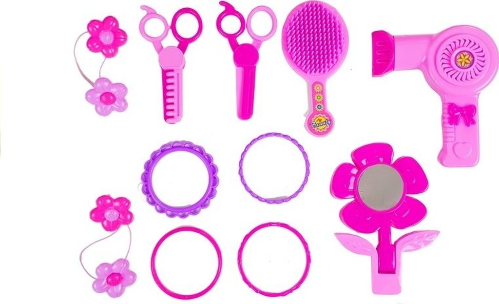Sada obsahuje: - toaletní stolek se zrcadlem - malé zrcátko - sušička - kartáč na vlasy, - náramky - gumičky do vlasů - nůžky
