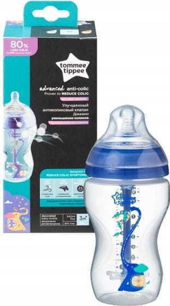 Kojenecká láhev Tommee Tippee ANTI-COLIC Advanced nabízí nejúčinnější řešení pro miminka se sklonem k břišním kolikám. Patentovaný antikolikový ventil zajišťuje dokonalý odvod vzduchu během krmení a umožňuje dítěti zcela plynulé sání bez polykání vzduchu. Unikátní silikonová savička věrně napodobuje mateřský prs při kojení a tím umožňuje maminkám snadné a bezpečné kombinování kojení a krmení z lahve. Funkce kontroly teploty mléka uvnitř lahvičky varuje rodiče v případě, že je tekutina teplejší než doporučených 37°C. Pro snadné čištění je součástí lahvičky i úzký dlouhý kartáček pro čištění trubičky ventilu. Náhradní silikonové savičky k těmto lahvičkám nesou rovněž označení Anti-Colic. Lahvičky jsou vhodné od 3 měsíců. Neobsahují bisfenol A.