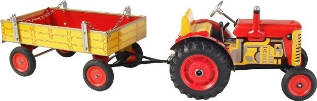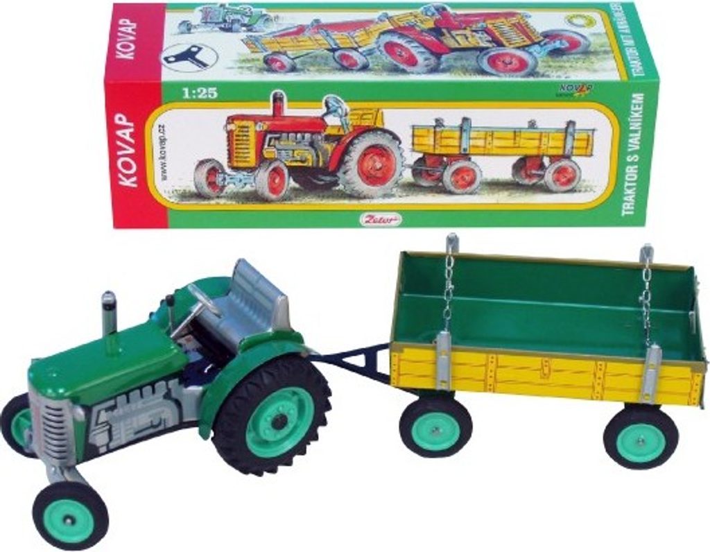 Traktor Zetor s valníkem červený od značky Kovap. Pohyb traktoru zajišťuje unikátní pérový strojek natahovaný klíčkem. Funkční převodovka má tři rychlosti dopředu a zpátečku. Traktor lze volantem skutečně řídit a navíc ho i zabrzdit ruční brzdou. Měřítko 1:25.