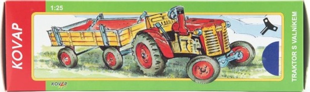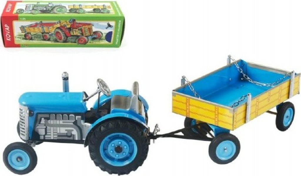 Kovový traktor ZETOR s valníkem na klíček s opravdovou funkční převodovkou se 3 rychlostmi dopředu, zpátečkou a neutrálem.